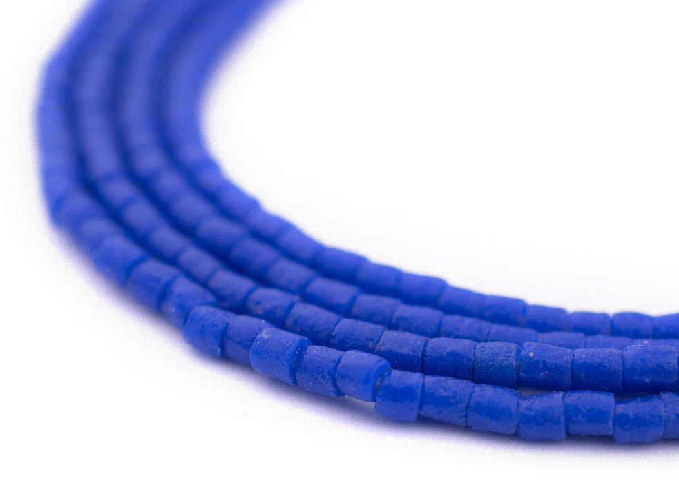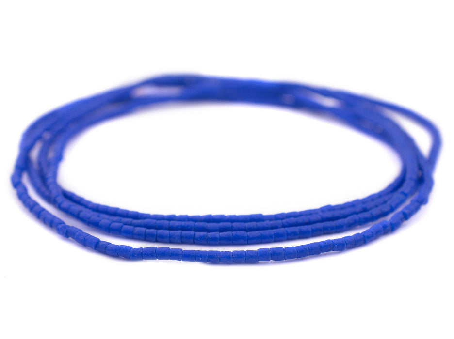 Checkout this beautiful strand of blue sandcast beads from Ghana, West Africa. Beads such as these are often worn as traditional waist beads. The process of making these beads is unique to Africa and has been used for over 1000 years. Pulverized glass of various colors is poured into a clay mold, using a cassava stem for the bead's hole. The mold is placed in a furnace and heated until the glass particles congeal without actually melting and the stem burns out. The Ghananians have been making beads in this manner since the 1600s. Multiple strands may be shown. Each strand is sold individually. Each bead measures approximately 3 x 3mm with a hole size of approximately 1mm. You will receive a full strand measuring approximately 25".