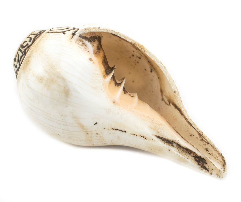 Conch shells are of spiritual and religious importance in Hinduism and Buddhism. This hand-carved conch shell was carefully crafted to show one of the eight Ashtamangala symbols. The Ashtamangala are a sacred set of symbols which are considered to point to the qualities of enlightenment. Within Buddhism, they are considered to be symbols of good fortune. The shell measures approximately 55-60 x 90-100mm. Each conch shell is unique and may vary slightly from the photo.