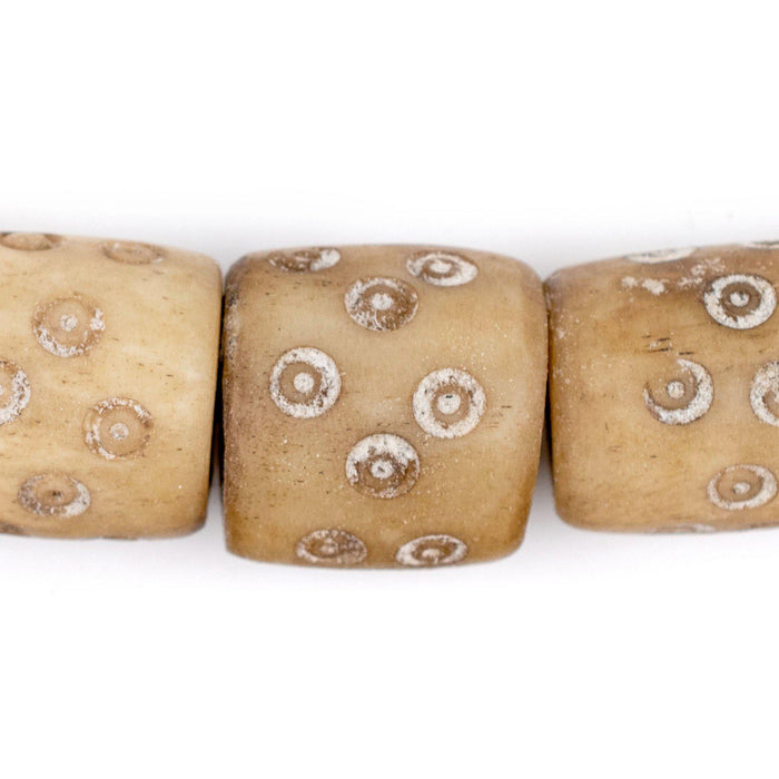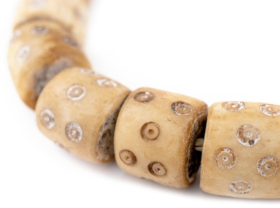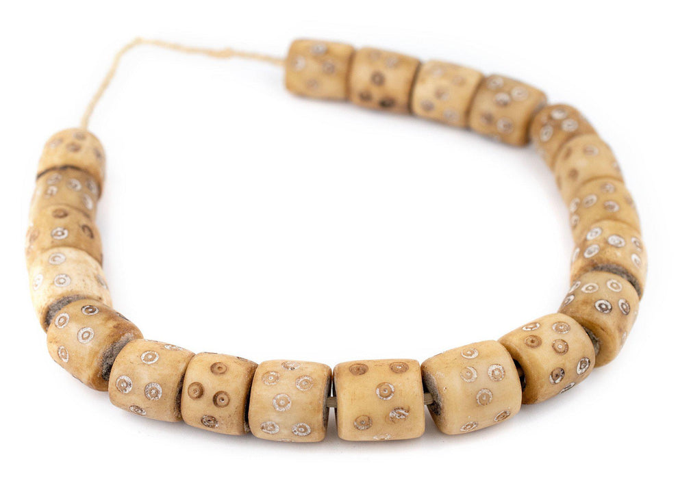 Admire this unusual strand of bone beads from Kenya. While Kenyan bone beads are common in a variety of shapes and styles, these beads come in a hard-to-find cylinder shape. East African bone beads are handcrafted by artisans using recycled cow bone. Each bead is individually carved and polished, and is truly one of a kind. These beads measure approximately 24-27 x 24-25mm, with a hole size of 3-4mm. Strands measure approximately 24", and have approximately 20 beads each. These are a great find for any beader looking to do something truly unique with their work!