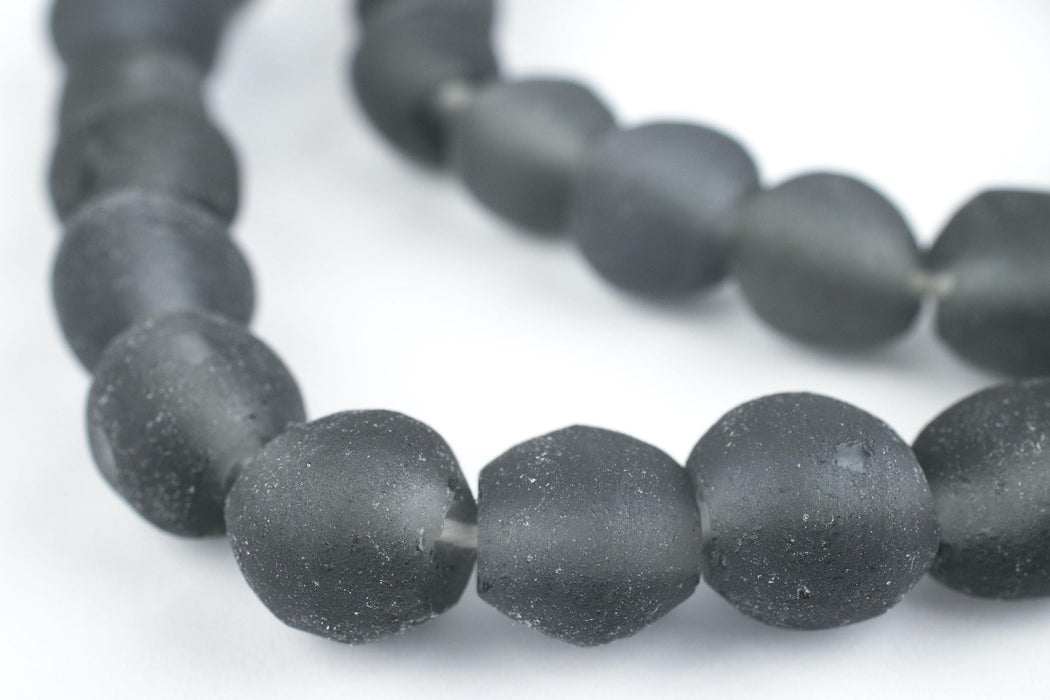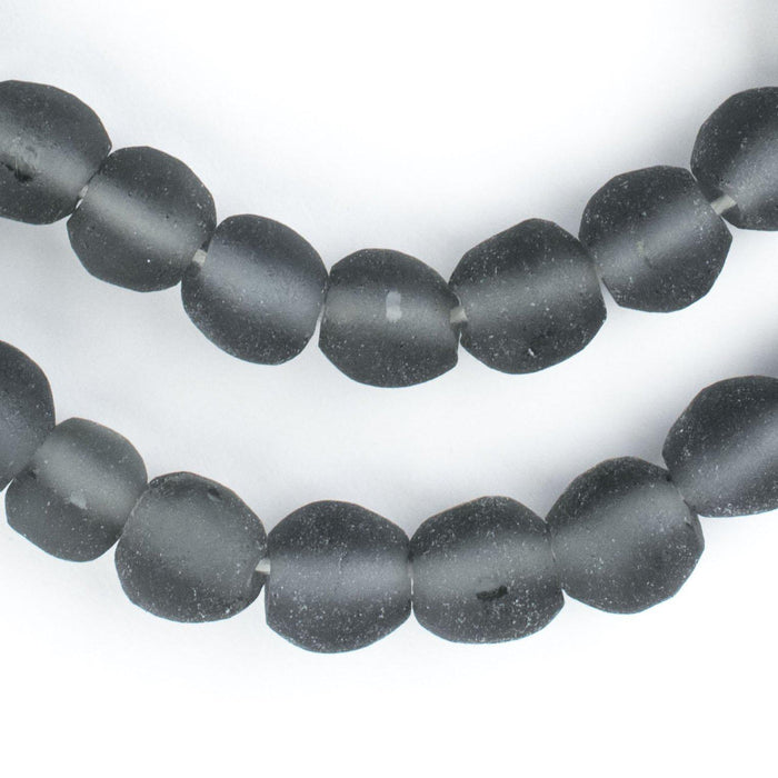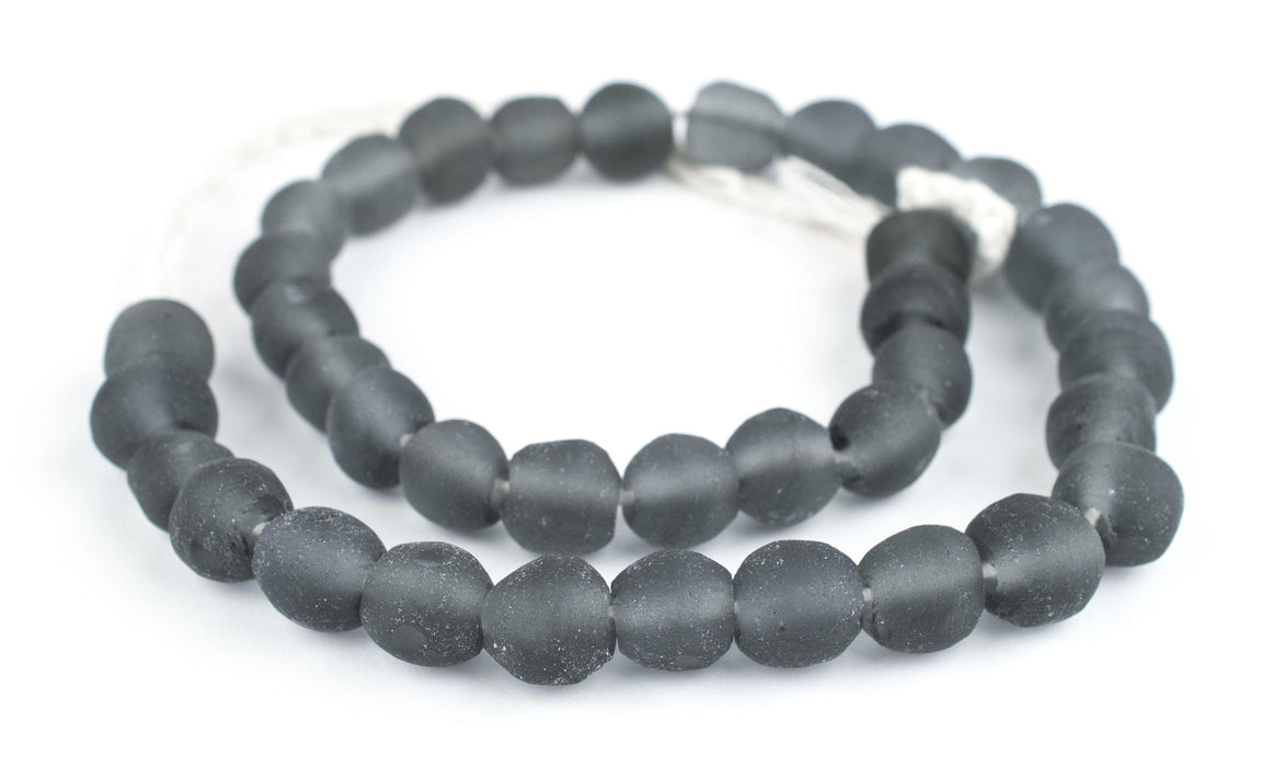 Beautiful strand of grey recycled glass beads from the island of Java. These frosted beads have been fashioned in a round shape and come in a natural matte finish. Each bead measures approximately 10-11 x 10-12mm diameter. Shape of beads may be slightly more flat on each end of beads than shown. Unique translucence let's light pass through. Pick and choose and your favorite colors!
