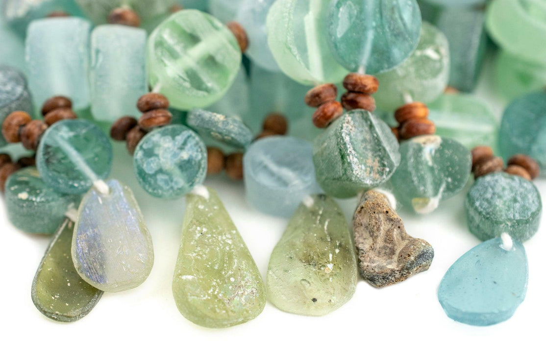 Admire this unique strand of beads made from ancient glass pieces. Commonly referred to as Roman Glass, the material for these beads is derived from ancient cups, vases, and perfume containers that have sustained the travails of time. The material for these beads is found in Central Asia, in regions along the silk road where the ancient kingdoms of Sogdiana and Bactria once thrived. If you look carefully, you will see that these beads have a unique patina endowed by the mineral deposits where the glass lay buried. Each glass piece has been individually drilled and threaded to create a strand. No two strands are alike but you will receive a strand similar to that pictured. Total strand length is 16". Truly something special to use in any jewelry piece. Limited supply! Note that while the material is said to be of old, possibly ancient origin, the precise age of the glass has not been independently verified.