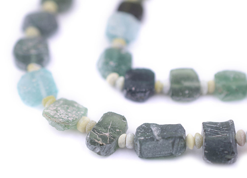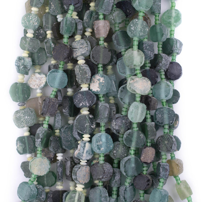 Admire this unique strand of beads made from ancient glass pieces. Commonly referred to as Roman glass, the material for these beads is derived from ancient cups, vases, and perfume containers that have sustained the travails of time. The material for these beads is found in Central Asia, in regions along the silk road where the ancient kingdoms of Sogdiana and Bactria once thrived. If you look carefully, you will see that these beads have a unique patina endowed by the mineral deposits where the glass lay buried. Each glass piece has been individually drilled and threaded to create a strand. No two strands are alike but you will receive a strand similar to that pictured. Some strands may have a pendant at the end while others may not. Each bead measures approximately 8-12 x 8-11mm, with a hole size of approximately 1mm. Total strand length is 16" including string with approximately 24 beads. Multiple strands may be pictured. Each strand is sold individually. Truly something special to use in any jewelry piece. Limited supply! Note that while the material is said to be of old, possibly ancient origin, the precise age of the glass has not been independently verified.
