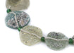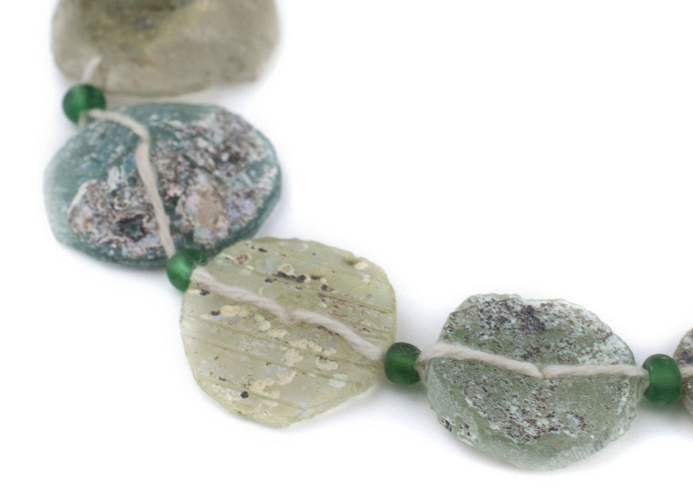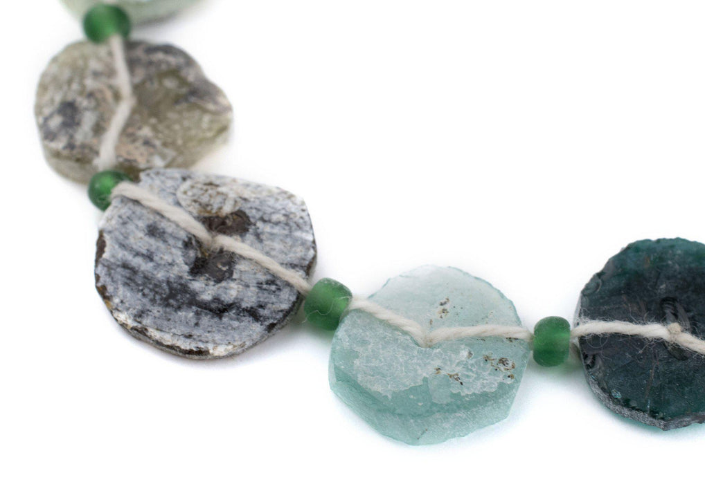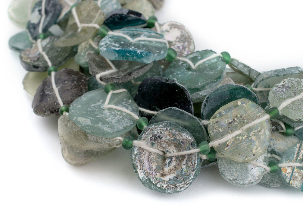 Admire this unique strand of beads made from ancient glass pieces found in the region along the historic silk road. Commonly referred to as Roman Glass, the material for these beads is derived from ancient cups, vases, and perfume containers that have sustained the travails of time. The glass pieces have been carefully cut, drilled, and strung together but you can see still the variation in color of the ancient glass. No two strands are alike but you will receive a strand similar to that pictured. These little beads are highly versatile and can be used as both spacers and accent beads. Truly something special to use in any jewelry design. Multiple strands may be pictured. Each strand is sold individually. You will receive a full 15" strand. Note that while the material is said to be of old, possibly ancient origin, the precise age of the glass has not been independently verified.