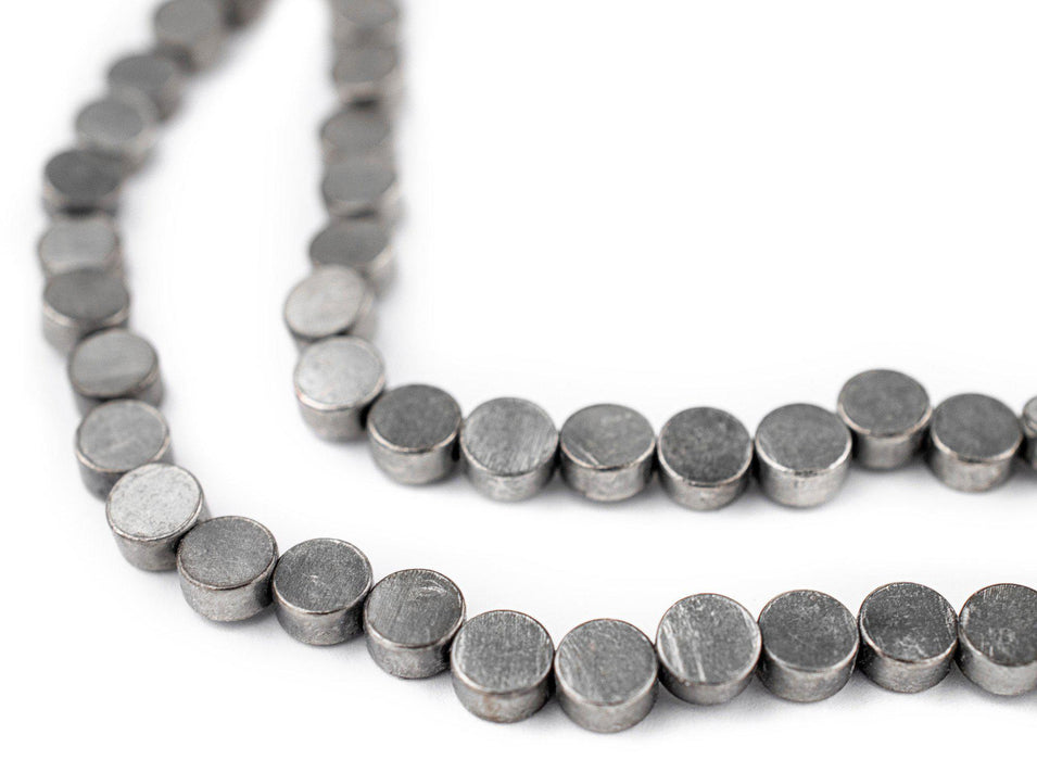 These circular silver beads have been fashioned in a design resembling small tablets. Drilled in the transverse direction, they will lie flat when strung on thread. Great for bracelets, necklaces, or general purpose spacers, each bead measures approximately 2.5mm thick and 5mm in diameter with a 1mm hole size. You will receive one 24" strand with each purchase.