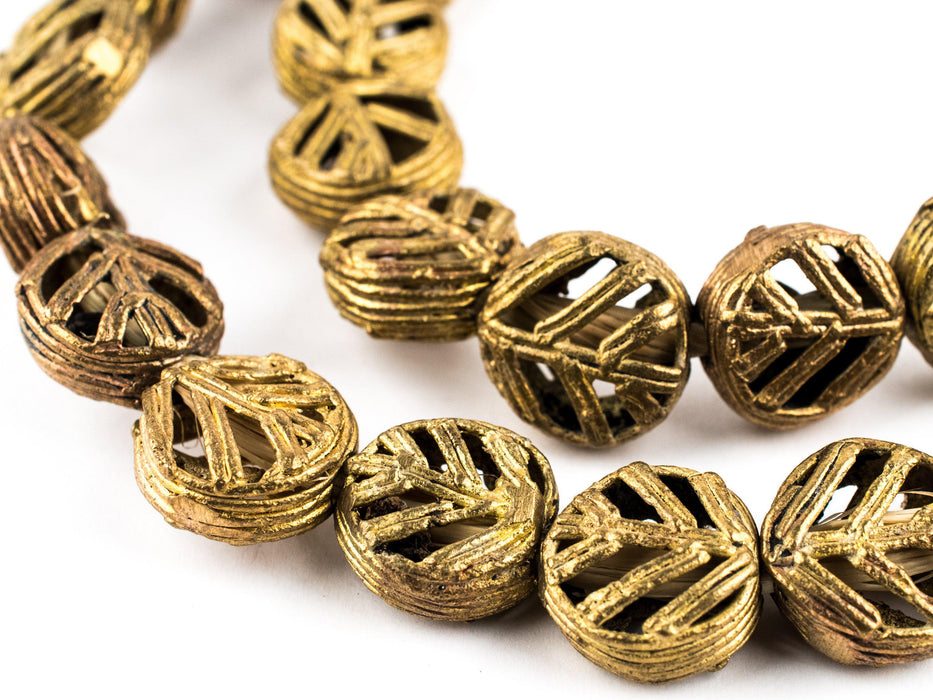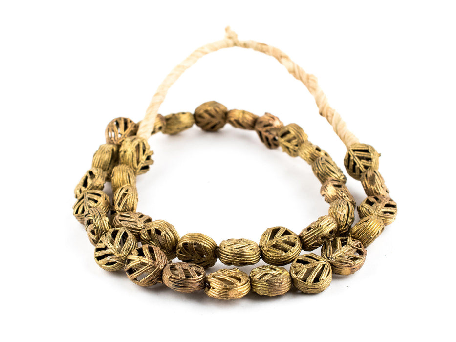 Take a look at these tabular-shaped Ghana Brass Trade Beads from Africa. Each bead is made individually through the "Lost Wax process" technique. This strand is about 27", with beads measuring approximately 14-16 x 15-16mm. Each strand may have 1-2 beads that are less than perfect and may vary slightly from strand pictured.