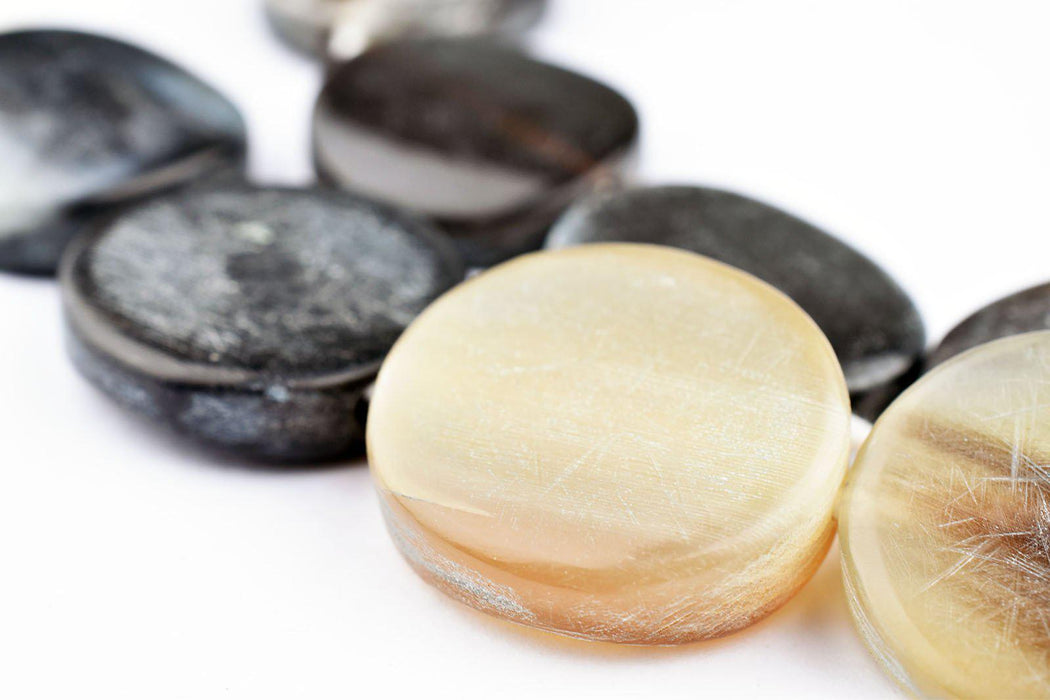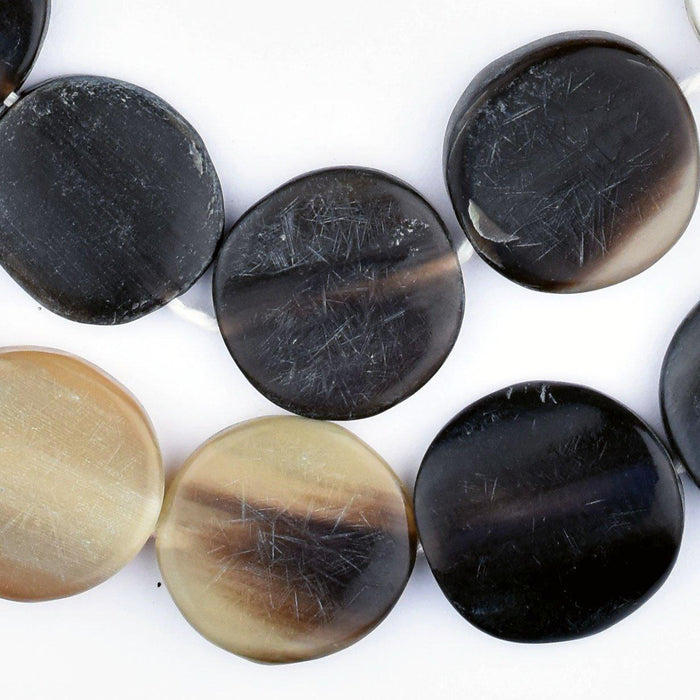 These multicolor color flat beads are made from natural horn. The slight variations in colors and shape of the beads will make them a fun addition to your beading project. Look carefully and you will see that each bead is unique. Individual beads measure 18-19 x 16-17mm diameter with approximately 23 beads on each 22" strand. Use them as spacers or accent beads. The rustic character of these beads is sure to add an authentic touch to your jewelry designs!