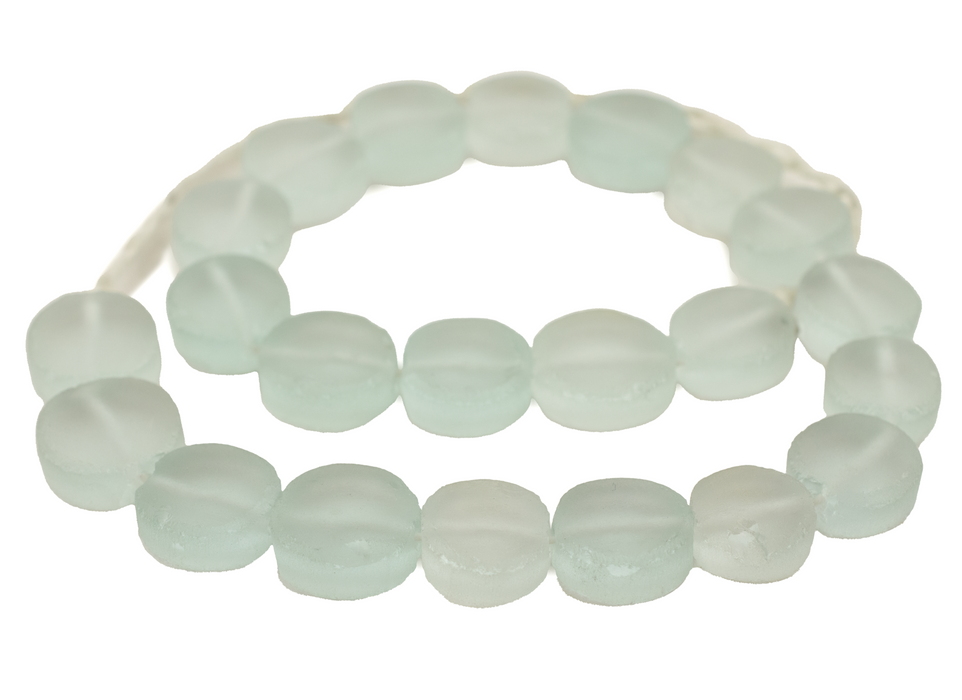 Beautiful strand of clear recycled glass beads from the island of Java. These frosted beads have been fashioned in a tabular shape and come in a natural matte finish. Each bead measures approximately 17-19 x 17mm, with a hole size of approximately 2mm. Unique translucence let's light pass through. Available in a variety of shapes. Pick and choose and your favorite colors!