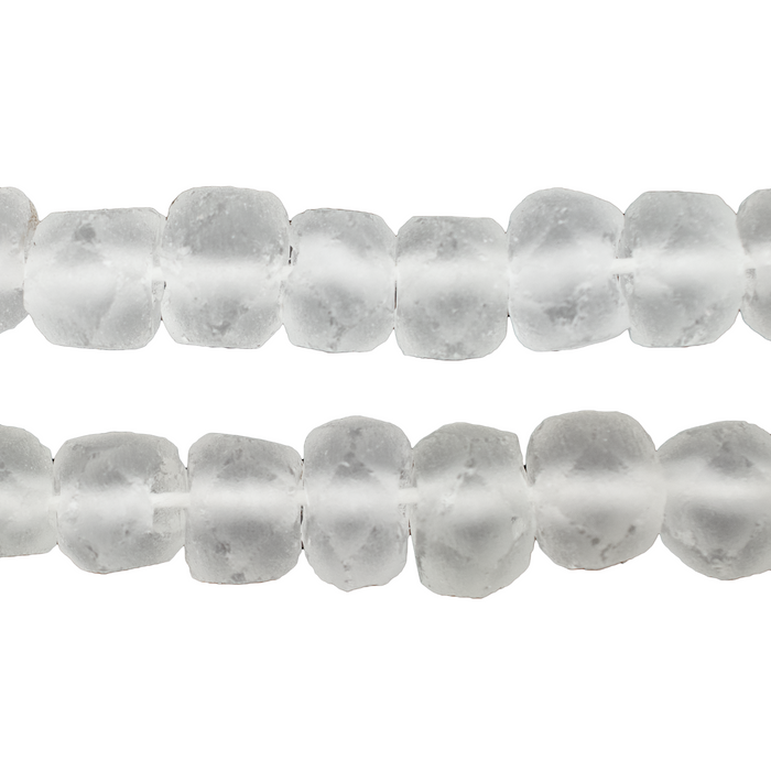 Beautiful strand of recycled glass beads from the island of Java. These unique clear color beads have been fashioned so that they look like pieces of rock candy crystal! Unique translucence let's light pass through.
