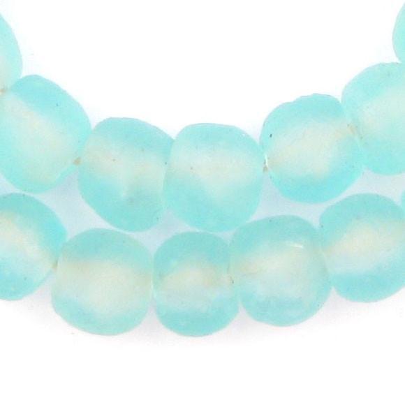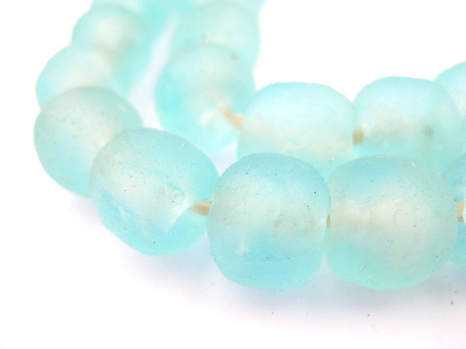 Recycled glass beads are a type of indigenously produced African bead from Ghana West Africa. These beautiful blue color recycled beads are made using an old method that has been used for centuries. The glass itself is derived from a variety of recycled sources including old beverage and medicine bottles. The procedure for making the beads consists of a number of steps whereby powdered glass is poured into molds of clay and baked in a specialized oven. These beads are produced in large part by the Krobo tribe and through recycling glass are environmentally friendly. Color may vary slightly from photo.