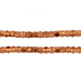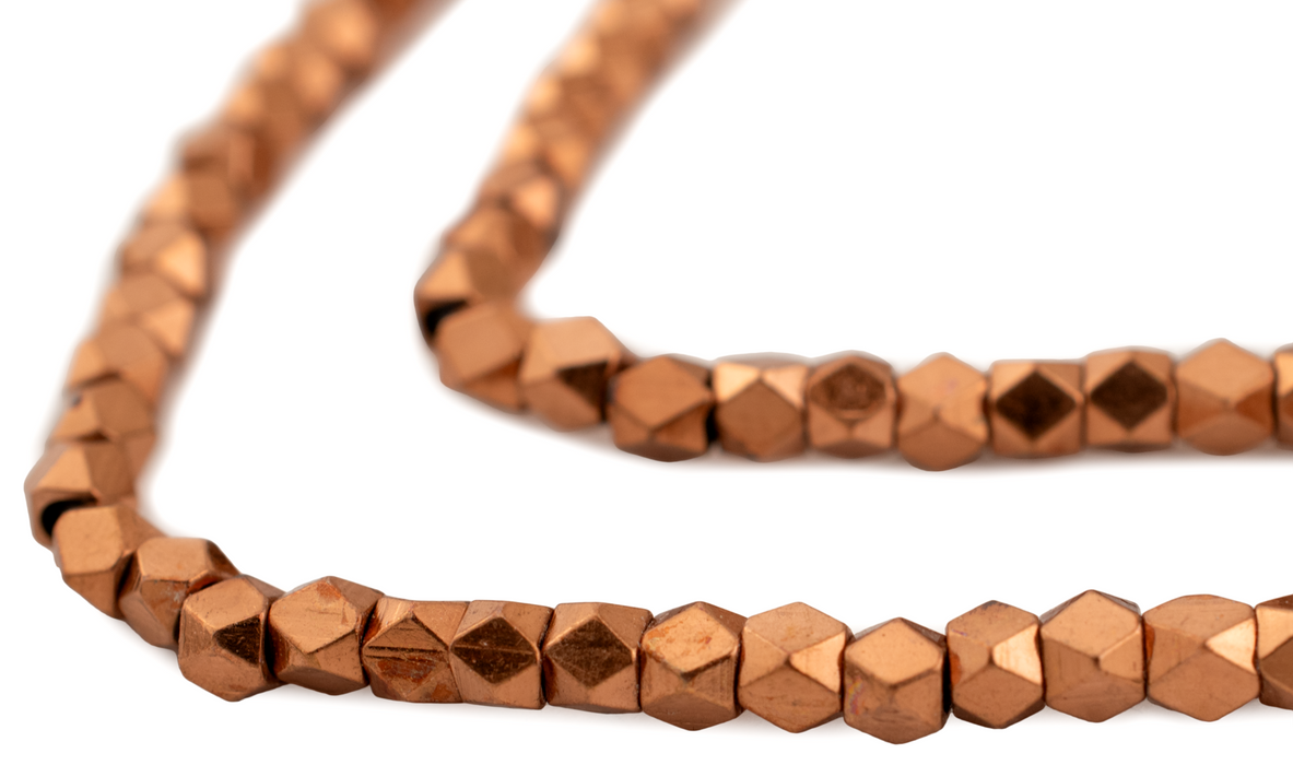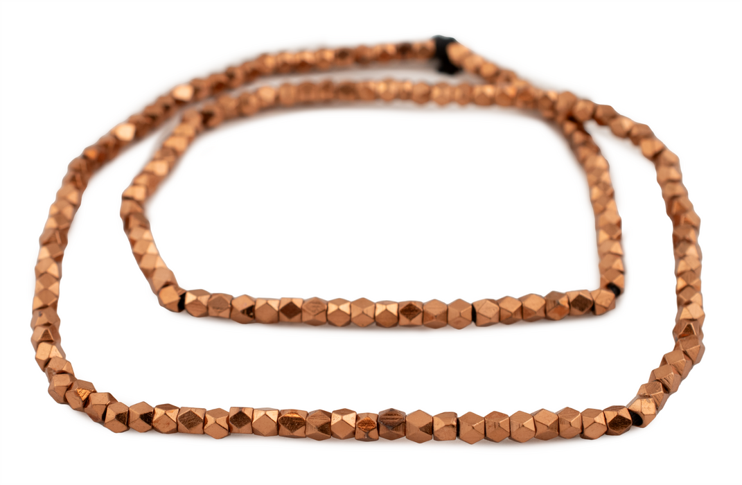 Take a look at this great strand of copper beads fashioned in a cornerless cube shape. Each strand is 24" inches long with approximately 150 beads measuring approximately 4 x 4mm diameter. These great beads are highly versatile and may be used as spacers or accents in your unique designs. They have a larger hole than usual, making them great for leather cord or other types of string. A great addition to your beading toolkit! This artisan product is made using premium copper electroplating over brass to make these copper finish customer favorites.