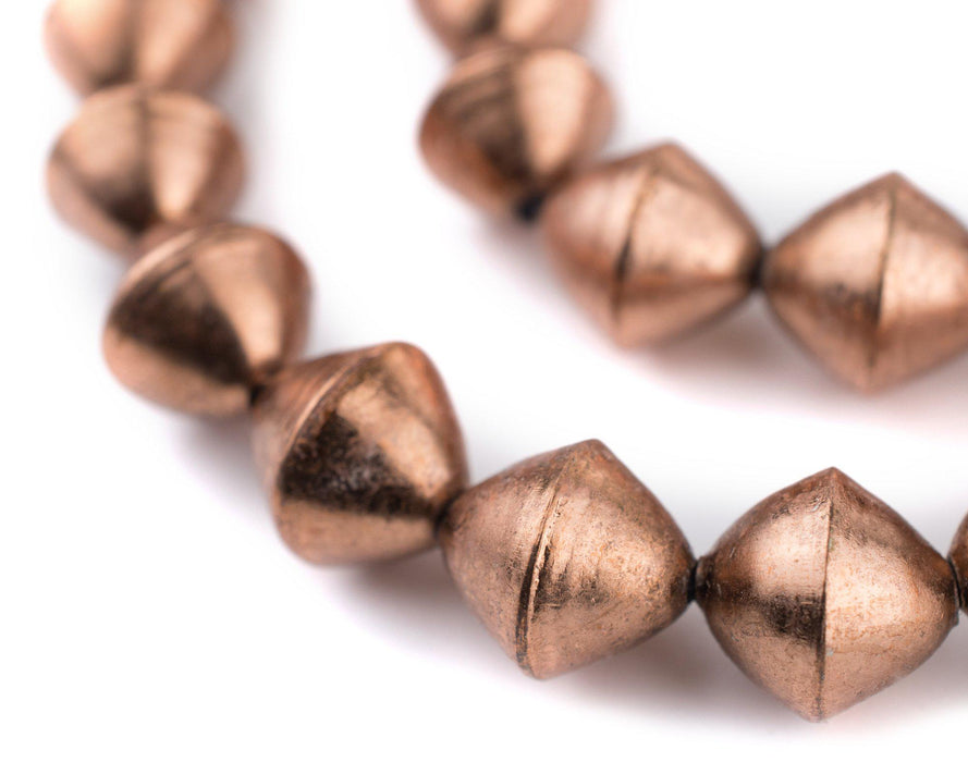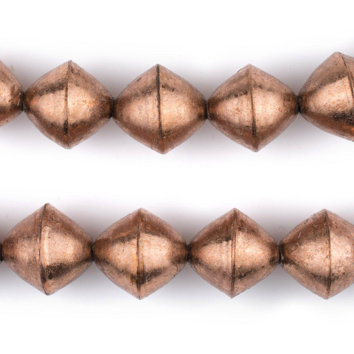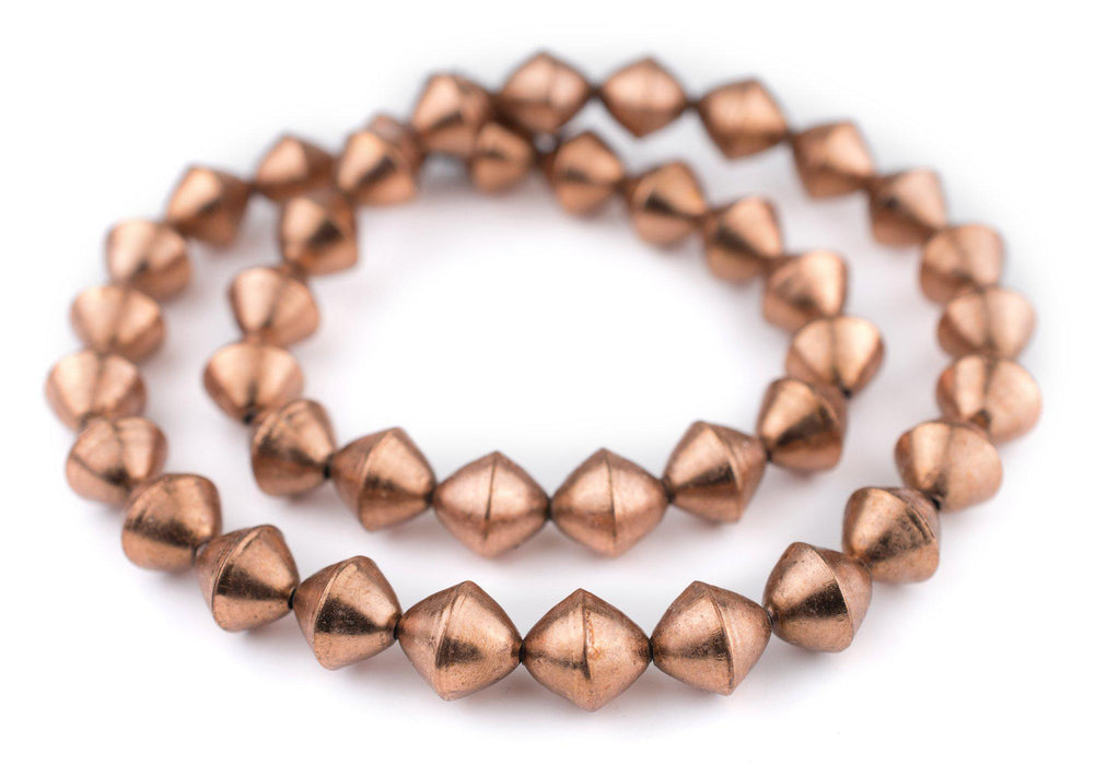These great bicone-shaped beads are bold and versatile. Each bead measures approximately 15-16 x 14-15mm, with a hole size of 2mm. Strands measure 24" in length. Look carefully to see the high quality of the workmanship, smooth finish, and rustic character. The hollow design of these beads makes them lighter than they look, without compromising quality. Try some today and see for yourself! This artisan product is made using premium copper electroplating over brass to make these copper finish customer favorites.