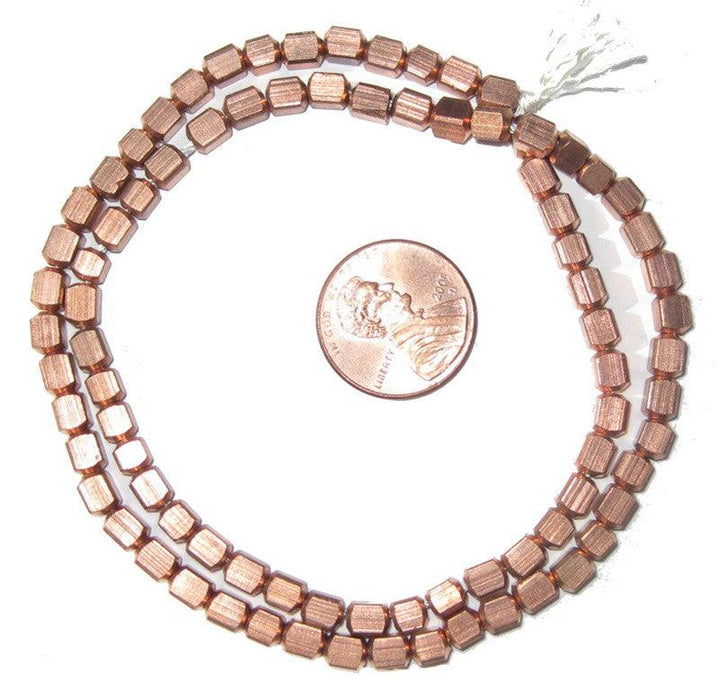 Take a look at this strand of Copper Metal Cube beads. The strand is 16" long, with beads measuring 4 mm in length and 3 mm in diameter. Origin is unknown but likely not African.