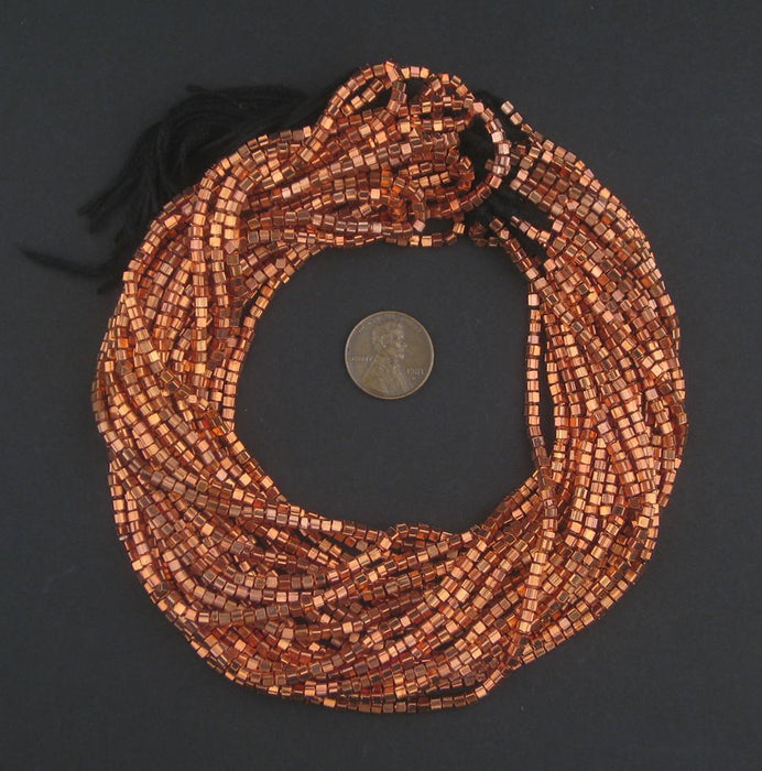 Take a look at this strand of Copper Metal Mini-Cube beads. The strand is 23" long, with beads measuring approximately 2mm across in both dimensions. These are highly versatile beads! Origin is unknown but likely not African. The picture shows multiple strands together. You will receive one strand for your order. This artisan product is made using premium copper electroplating over brass to make these copper finish customer favorites.