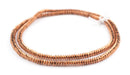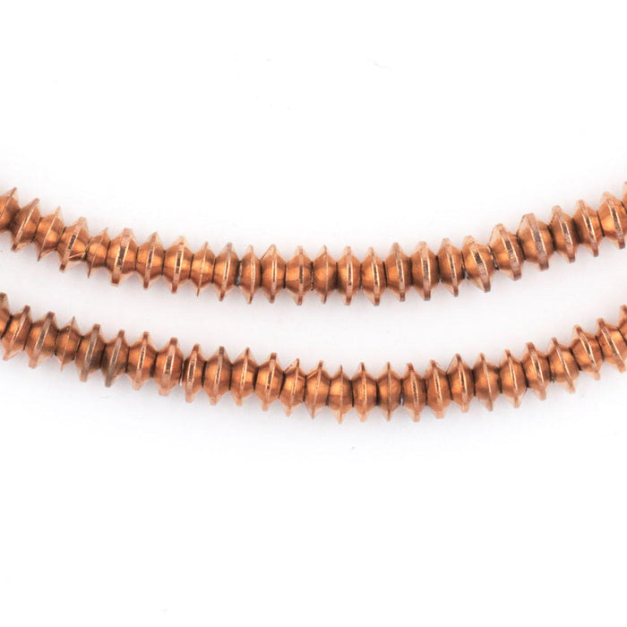 Beautiful strand of high quality, ethnic copper beads measuring 24" in length. Individual beads measure 2x5mm in size, with holes measuring 2mm. Each strand includes approximately 275 beads. These highly versatile beads make great spacers, or may be used to accent your unique beaded designs. Feel the solid weight of these beads in your hands, and you'll surely appreciate their fine quality.