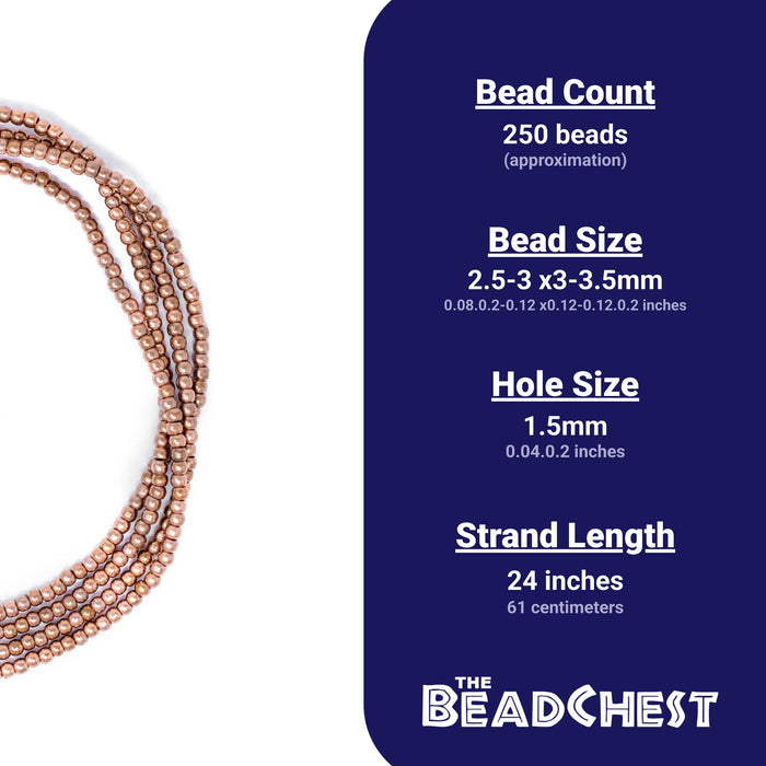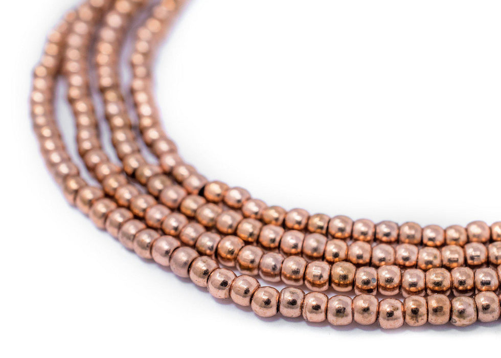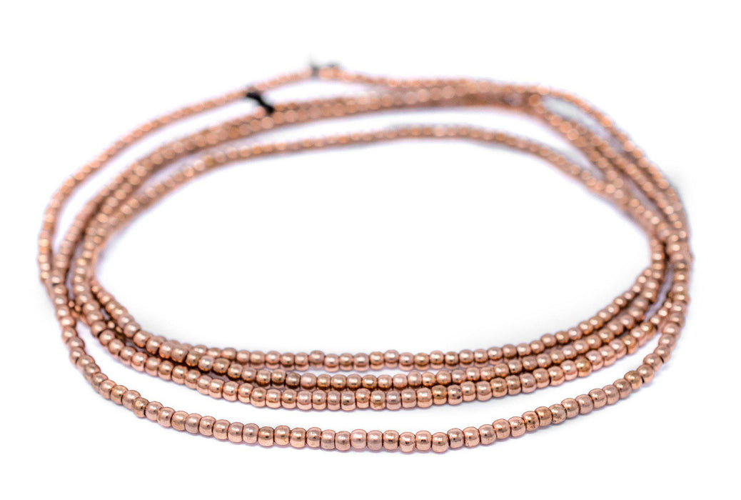 Take a look at these beautiful strands of African Copper Seed Beads. Copper Seed Beads like this are perfect as a spacer bead and even look good when mixed together with our other African Seed Bead styles. Each handcrafted strand is approximately 24" in length. Each artisan bead is about 2.5-3 x3-3.5mm with a roughly 1.5mm hole. Multiple strands pictured. Each strand is sold individually. Shade of copper may vary slightly from photo. Get yours today! This artisan product is made using premium copper electroplating over brass to make these copper finish customer favorites.
