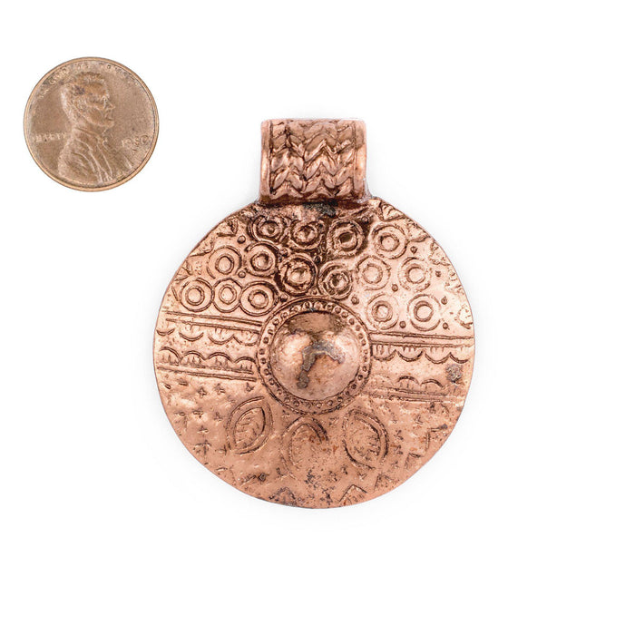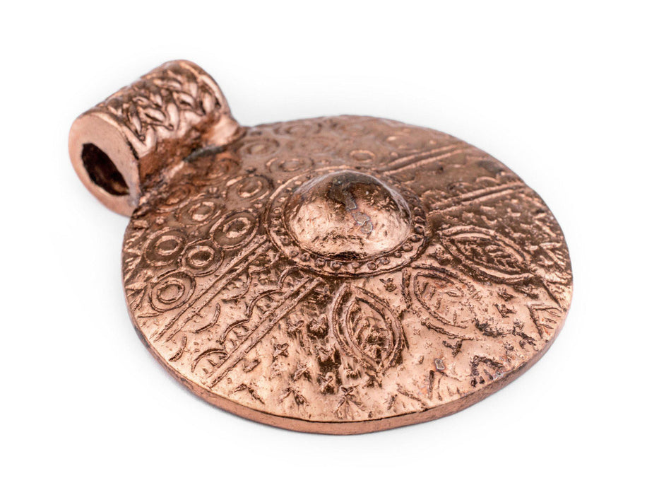 Our sources in West Africa tell us this copper pendant is designed in the shape of a traditional tribal shield. The pendant measures approximately 55 x 45mm in size and has a hole size of approximately 6mm. Its exceptionally large hole means it can be strung on nearly any type of cord or string including very thick leather. Pay attention to the detail and appreciate the fine craftsmanship of this casted copper cross! This artisan product is made using premium copper electroplating over brass to make these copper finish customer favorites.