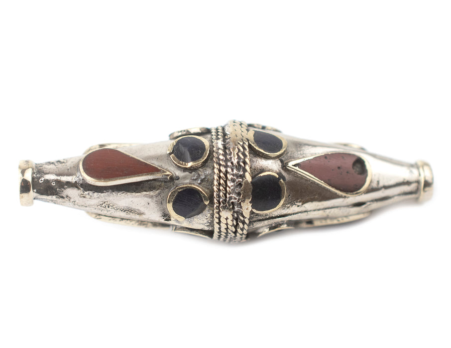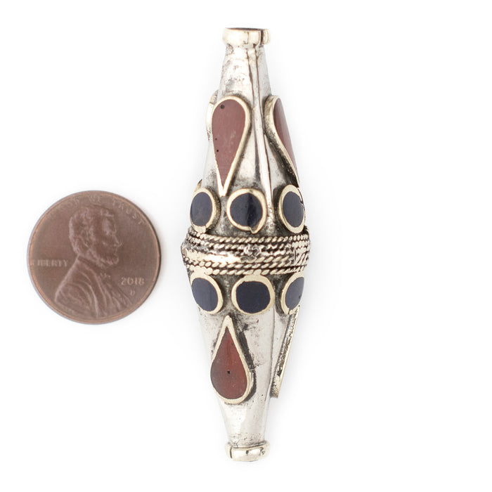 Coral and Lapis-Inlaid Elongated Afghan Tribal Silver Bead (60x18mm)