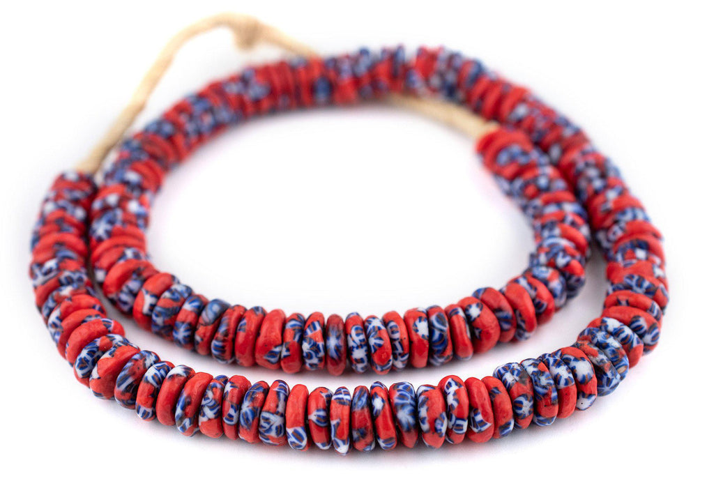 This uniquely patterned strand of rondelle beads is made using traditional methods used to create powder glass beads. The procedure for making the beads consists of a number of steps whereby powdered glass is poured into molds of clay and baked in a specialized oven. Individual beads measure 3-4 x 11mm and have a hole size of approximately 3mm.