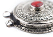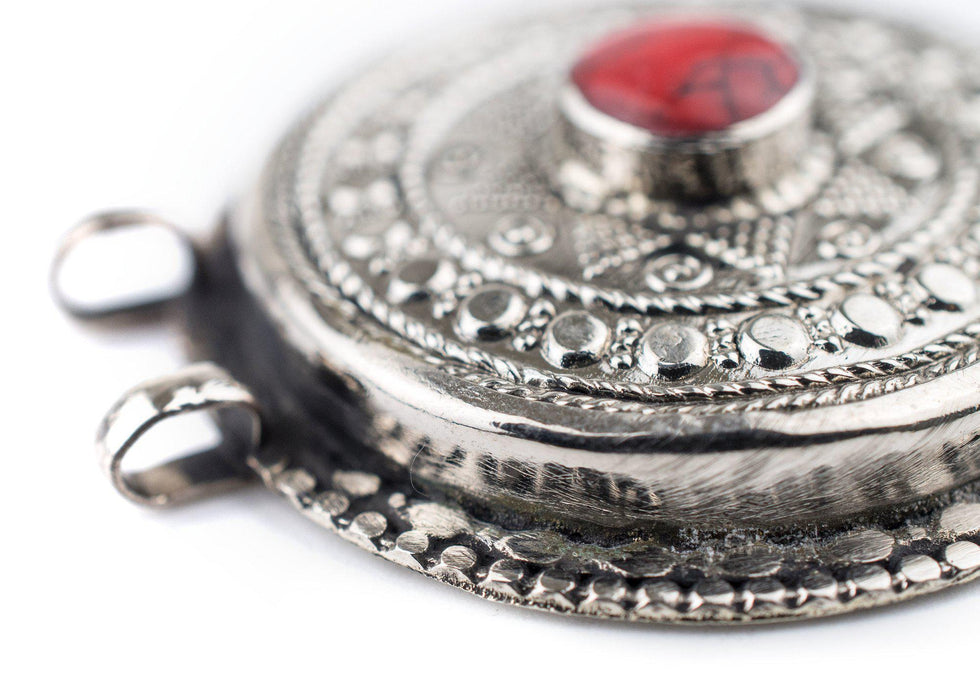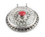 This beautiful silver pendant from Afghanistan was handcrafted and is traditionally worn by indigenous tribe members. Each pendant is carefully crafted and set with a stone cabochon in the center, meant to resemble natural coral. The pendant has two large 4mm loops at the top which are large enough to fit thick cord such as leather. Each pendant measures approximately 42 x 46mm. Beautiful and authentic tribal piece at a great price!