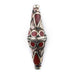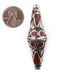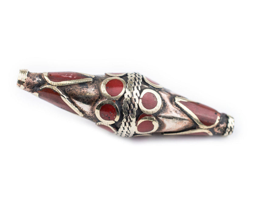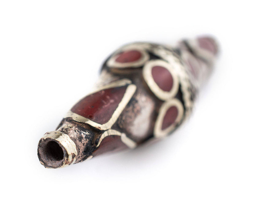Coral-Inlaid Elongated Afghan Tribal Silver Bead (60x18mm)
