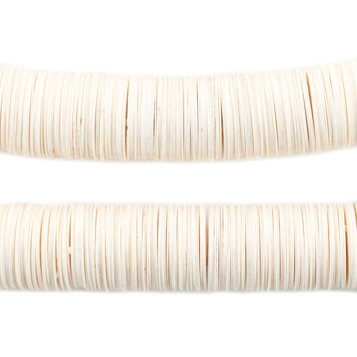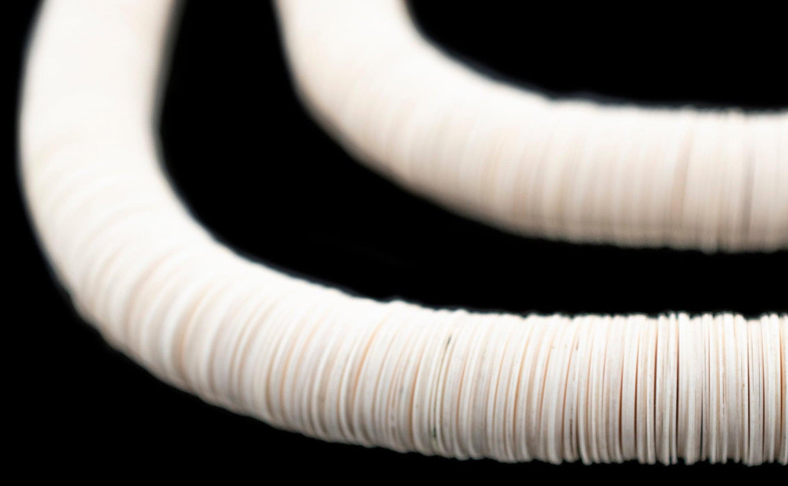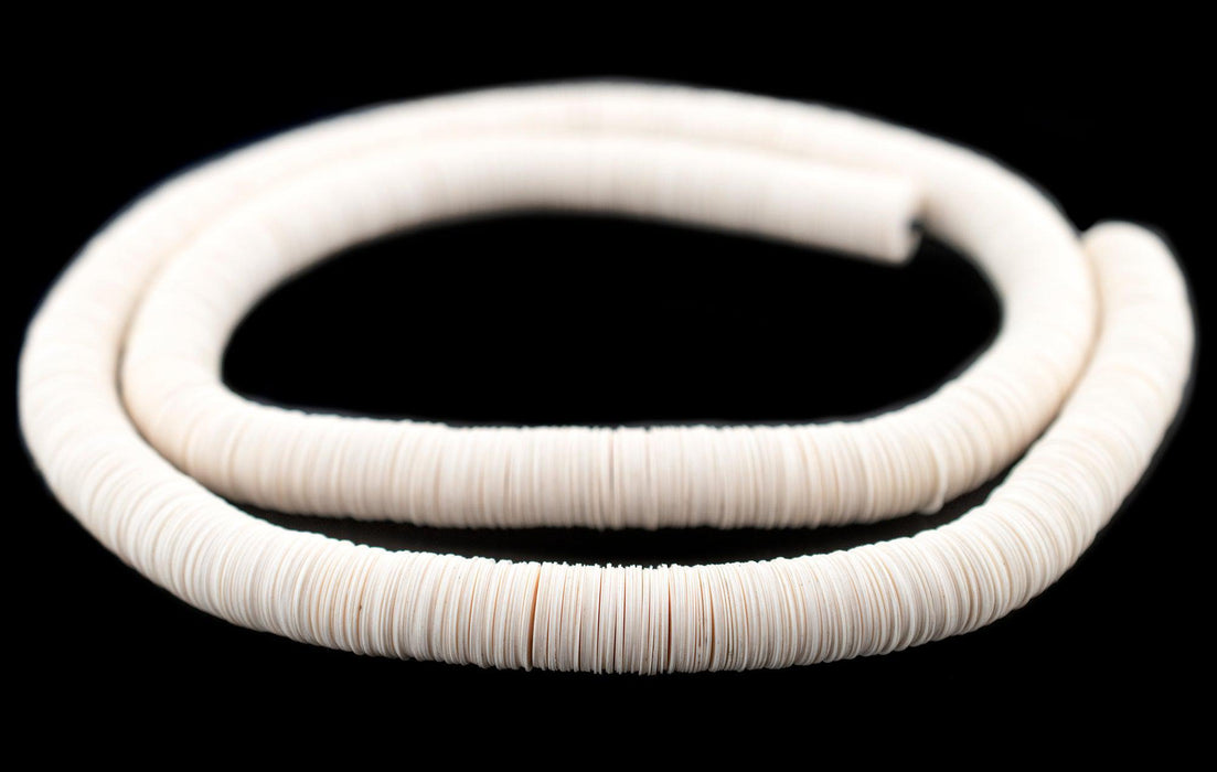 Take a look at this beautiful strand of cream white African vinyl beads. Beads such as these are found in Ghana and Nigeria where they are sometimes worn as waist beads. Older versions of vinyl beads were said to be made from recycled phonograph records. Each bead measures approximately 0.3 x 14mm, with a hole size of approximately 1mm. You will receive one strand measuring approximately 35”. There are around 2600 beads on each strand. These beads are light, fun to wear and also versatile for jewelry designs. Grab a strand for yourself today.