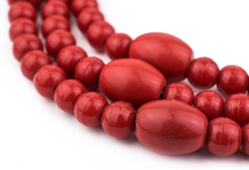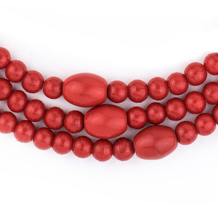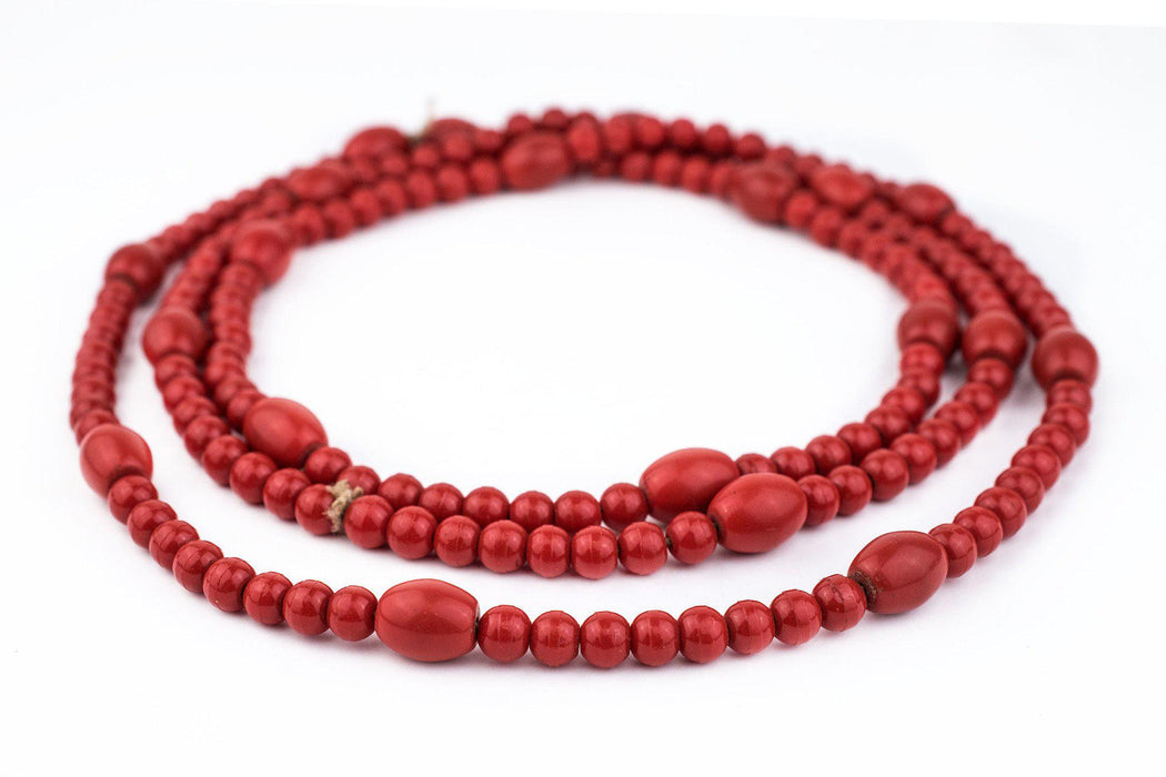 This unusual strand is comprised of two varieties of vintage pressed glass beads from the former Czechoslovakia. Red Padre and Colodonte beads are arranged in an alternating pattern. This is an exceptionally long double strand measuring nearly 61" in length. The beads are in excellent condition and measure between 8-16mm in size. Truly a one of a kind piece!