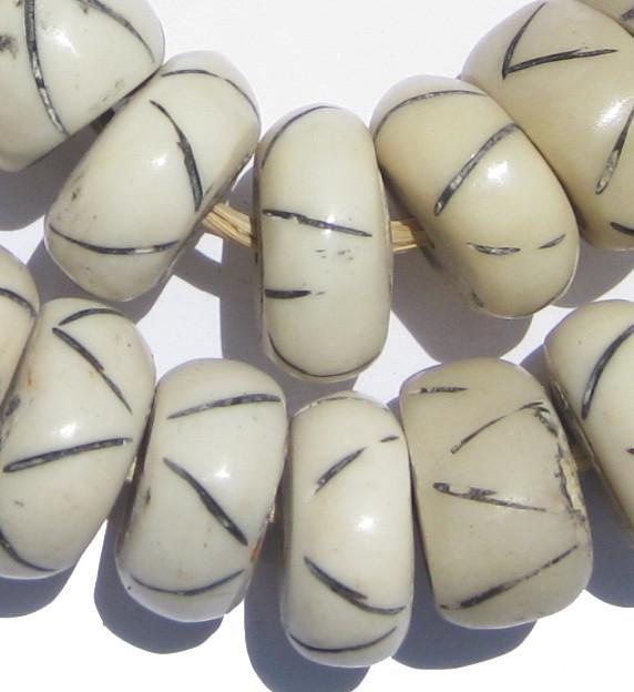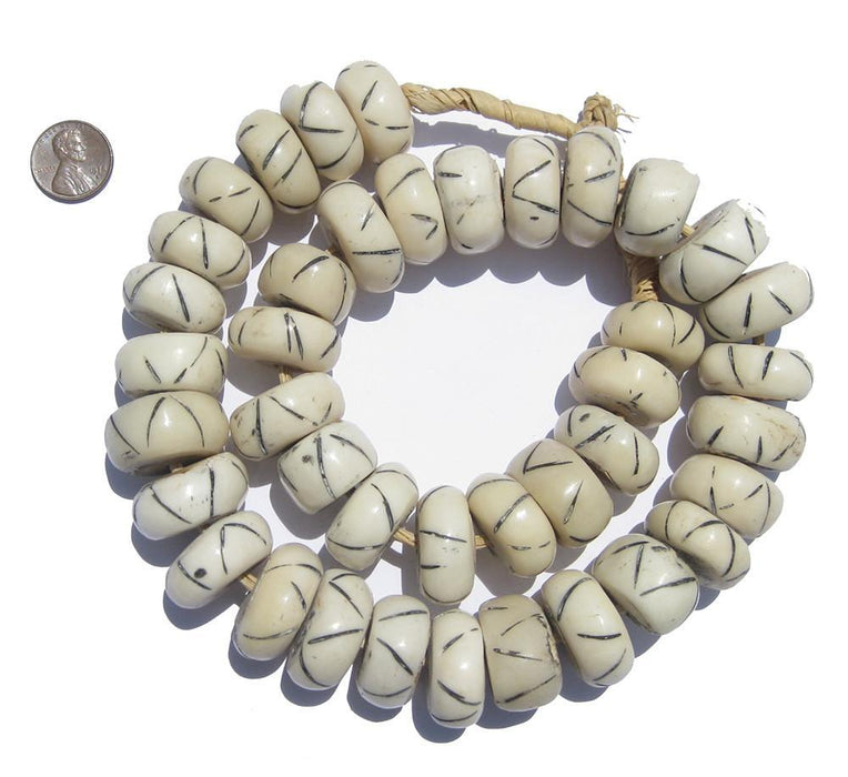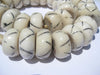 Checkout these beautiful White Bone from Kenya, Africa! The strand is approximately 24" long, and each bead is about 23-25mm in diameter. Some strands may not be on raffia. Due to the handmade nature of these beads some beads may have a wood core that is more secure than others. Finish of some strands may be slightly more matte than photo.