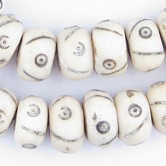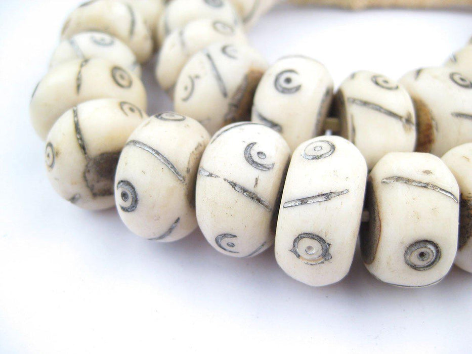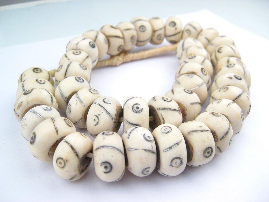 Admire this beautiful strand of bone beads from Kenya. East African bone beads are handcrafted by artisans using recycled cow bone. Each bead is individually carved and polished, and is truly one of a kind.
