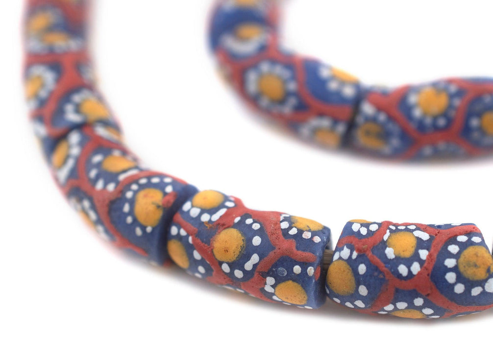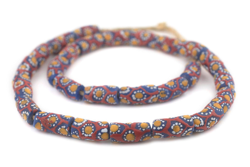 This beautiful strand of African powder glass beads was made by the people of Krobo Mountain in Ghana, West Africa. Many designs of Krobo beads are patterned to resemble old Venetian fancy trade beads. They are made from bottles and other glass items that are turned into powder, then poured into molds in order to create beads. Decorations on the beads are made with a paste made of colored glass powder and water which is applied by hand using a thin wooden stalk. The beads are cooked a second time to fix the decor. Each bead measures approximately 23-27 x 12-13mm with a hole size of approximately 3mm. You will receive a full strand measuring approximately 27". Limited supply.