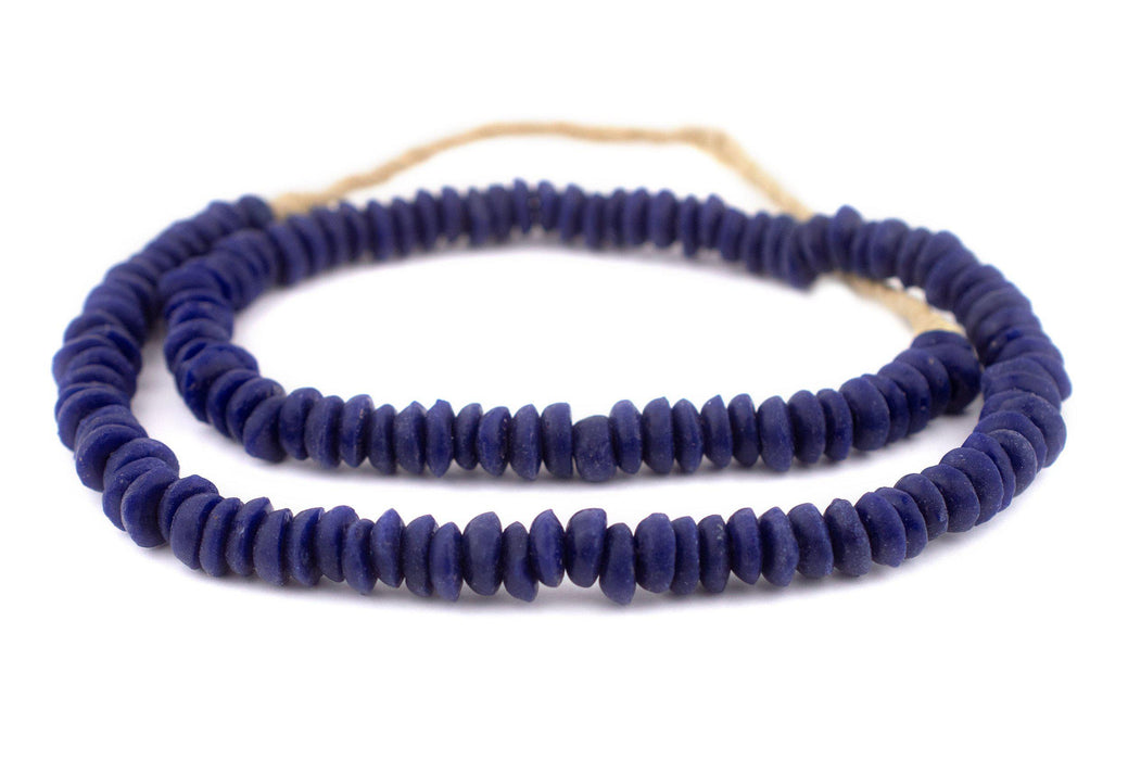 Checkout this beautiful strand of blue color Ashanti glass saucer beads. The process of making these beads is unique to Africa and has been used for over 1000 years. Pulverized glass of various colors is poured into a clay mold, using a cassava stem for the bead's hole. The mold is placed in a furnace and heated until the glass particles congeal without actually melting and the stem burns out. The Ghanaians have been making beads in this manner since the 1600s. Each bead measures approximately 2-3 x 9-10mm with a hole size of approximately 2mm. You will receive a full strand measuring approximately 28". Shade of blue may vary slightly from photo. Get yours today!