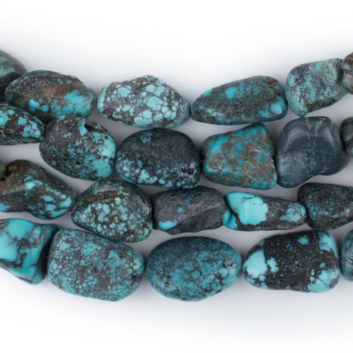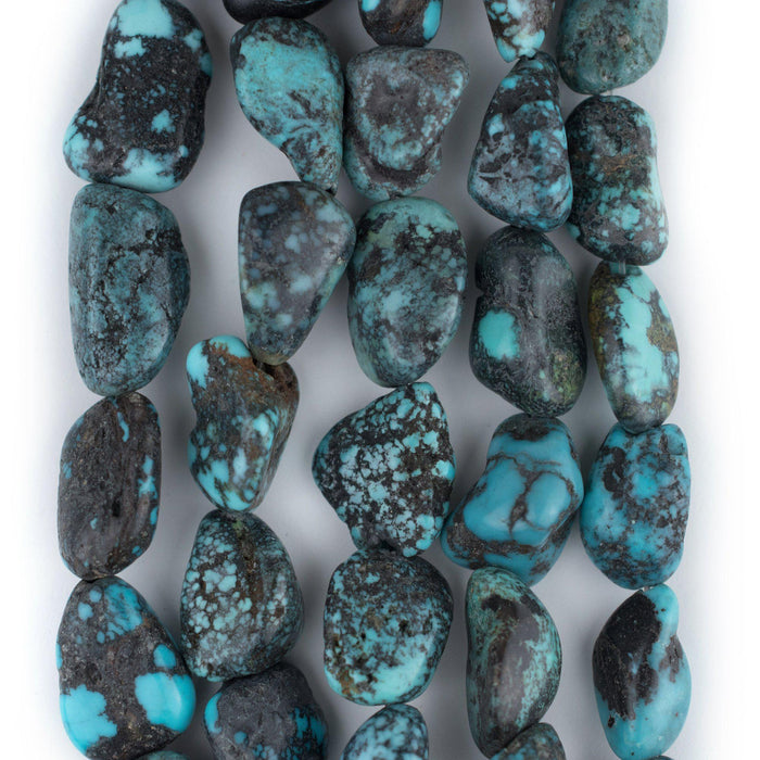 Admire the intense blue color of these dark turquoise beads. The mottled texture of the matrix gives the stone a rustic and ethnic feel. Turquoise has been prized throughout the ages by many cultures including the Aztecs and American Indians. Each strand of these turquoise nuggets will include approximately 25 beads measure 15-20mm wide by 6-11mm in diameter. No two strands are alike. Multiple strands pictured, each is sold individually.