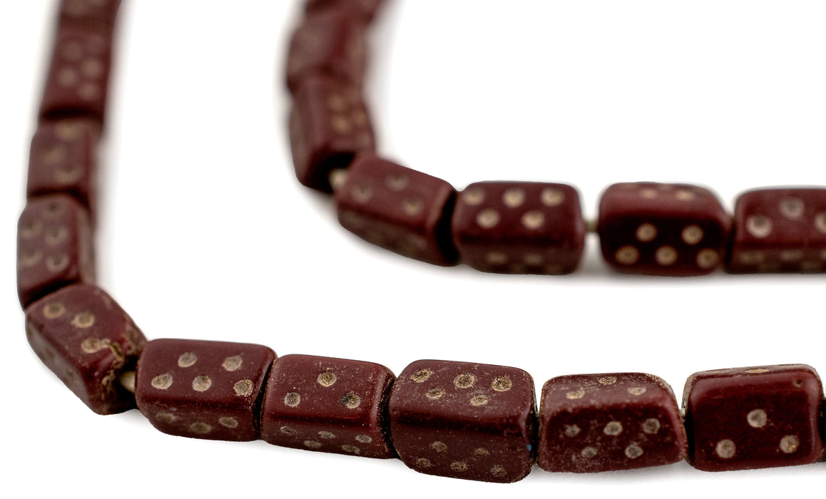 These great little beads are commonly referred to as Dice Beads due to their resemblance to playing dice. In fact, they are made by a process similar to some vintage dice cubes whereby the glass is pressed using glass-making techniques. The production of pressed glass beads was a major industry of 20th century Bohemia and many special designs were created for export to the African trade. Today, vintage Dice Beads such as these, though harder to find, can still sometimes surface in Ghana, West Africa. Note that due to age, some strands may show signs of wear.