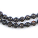 Evocative of a lost world, these beautiful Arabian prayer beads have been handcrafted by a master artisan. Look carefully and you will see that each bead has been exquisitely inlaid in meticulous detail, a quality of work hard to find in today’s day and age. The refined quality of these beads belies the long journey they have traveled through the back alleys and markets of North Africa. Prayer beads such as these embody the intersection artistic expression and faithful devotion that are a cornerstone of the Islamic world. Each bead on this strand measures approximately 6-7 x 6-7mm with hole size of < 1mm and strand length of 33" long. Metal inlay may not be sterling. Use as-is or to accent your beaded creations. Limited Supply. Get yours today!