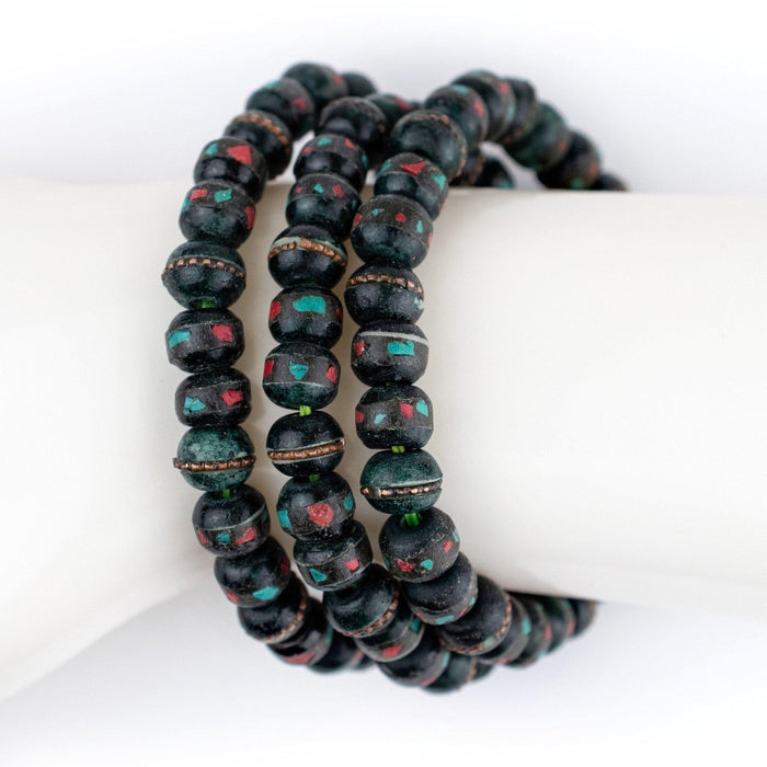 Malas are traditionally used in Buddhist culture as a part of the practice of meditation, however, today malas are enjoyed by people around the world looking to gain mental clarity and live in the present. Our collection of mala bracelets are handmade in Nepal using traditional inlaid beads. These beads are hand carved, inlaid with coral and turquoise style pieces, and strung 27 beads per 7.5 inch bracelet. Available in over 15 colors, choose your favorites to build your own unique stack! Beads may also be repurposed into your own unique jewelry designs. Multiple bracelets may be pictured, however each bracelet is sold individually.