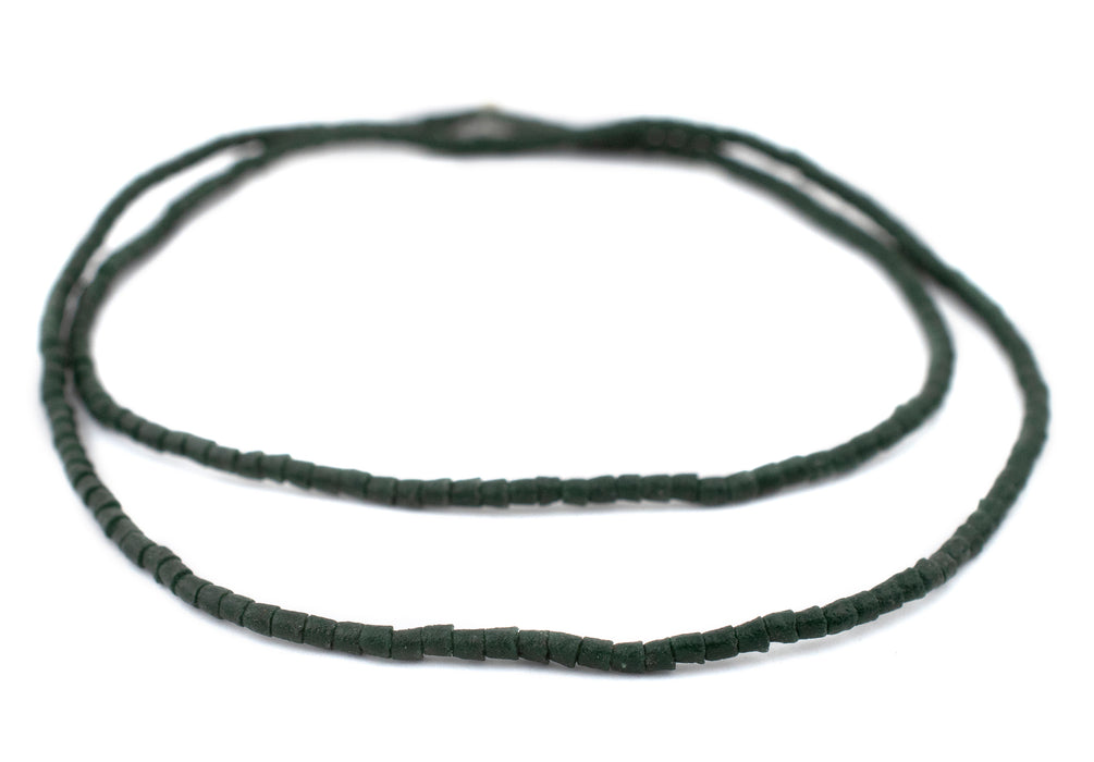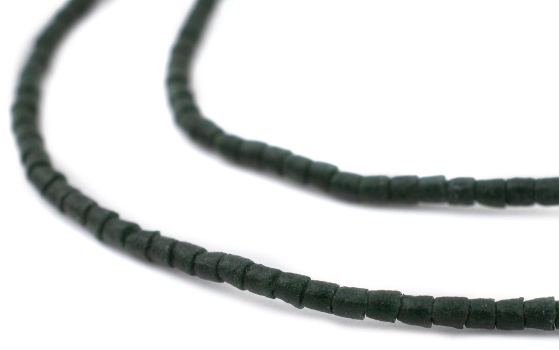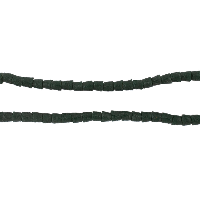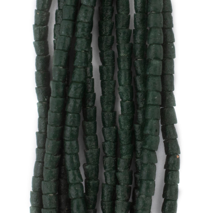 Checkout this beautiful strand of green sandcast beads from Ghana, West Africa. Beads such as these are often worn as traditional waist beads. The process of making these beads is unique to Africa and has been used for over 1000 years. Pulverized glass of various colors is poured into a clay mold, using a cassava stem for the bead's hole. The mold is placed in a furnace and heated until the glass particles congeal without actually melting and the stem burns out. The Ghanaians have been making beads in this manner since the 1600s. Multiple strands shown. Each strand is sold individually.