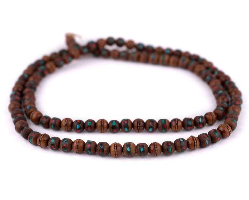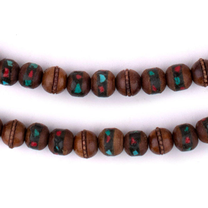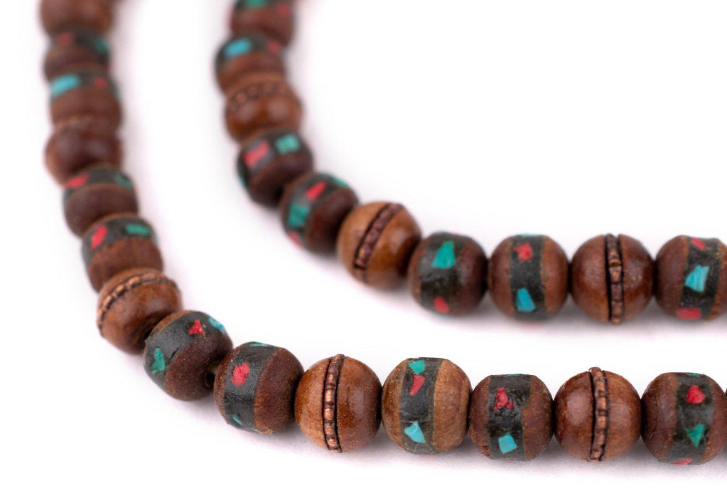These beautiful mala beads are hand-carved from natural wood in the mountainous region of Nepal. Each bead is inlaid with various materials including turquoise, coral, and brass. Fragrant and aromatic, these delightful beads exude a pleasant meditative sandalwood scent. Each strand has 108 beads, measuring approximately 7-8 x 8mm in size. Shade of wood may vary slightly from strand to strand. Can be used as is, or re-purposed in your own jewelry creations.