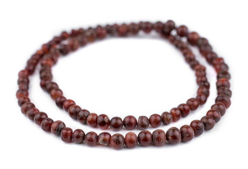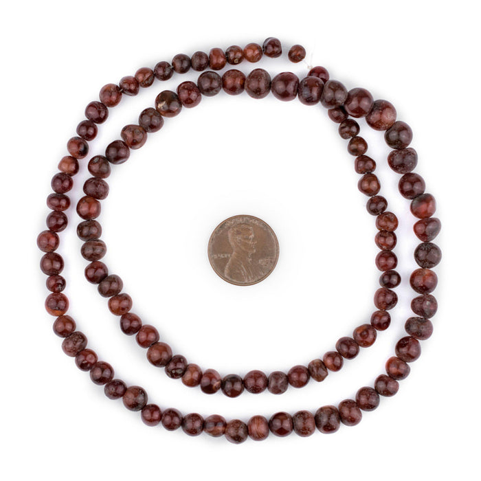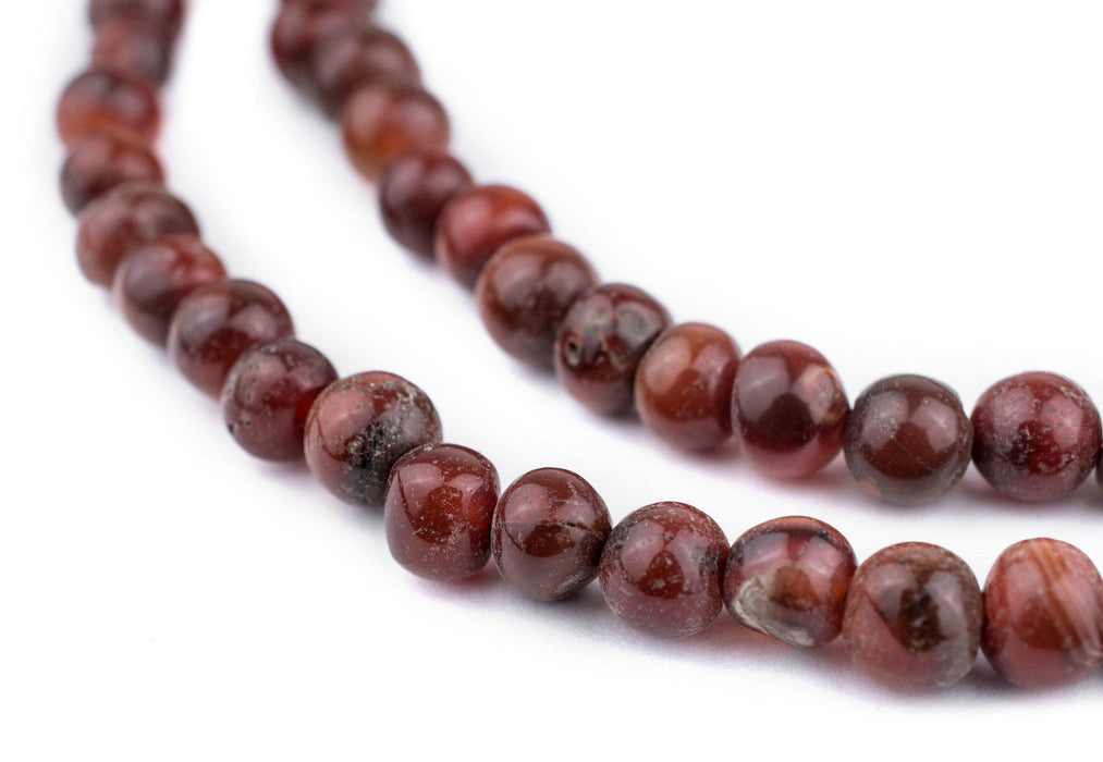 Beautiful round agate beads from Burkina Faso in deeper color tones. Beads will vary in size between 6-10mm in diameter. Most strands are graduated. Each strands shows minor variation in color and size and may differ slightly from strand pictured. Some strands may not have raffia.