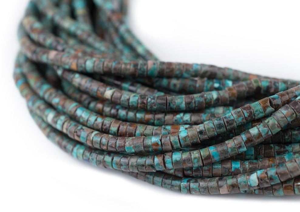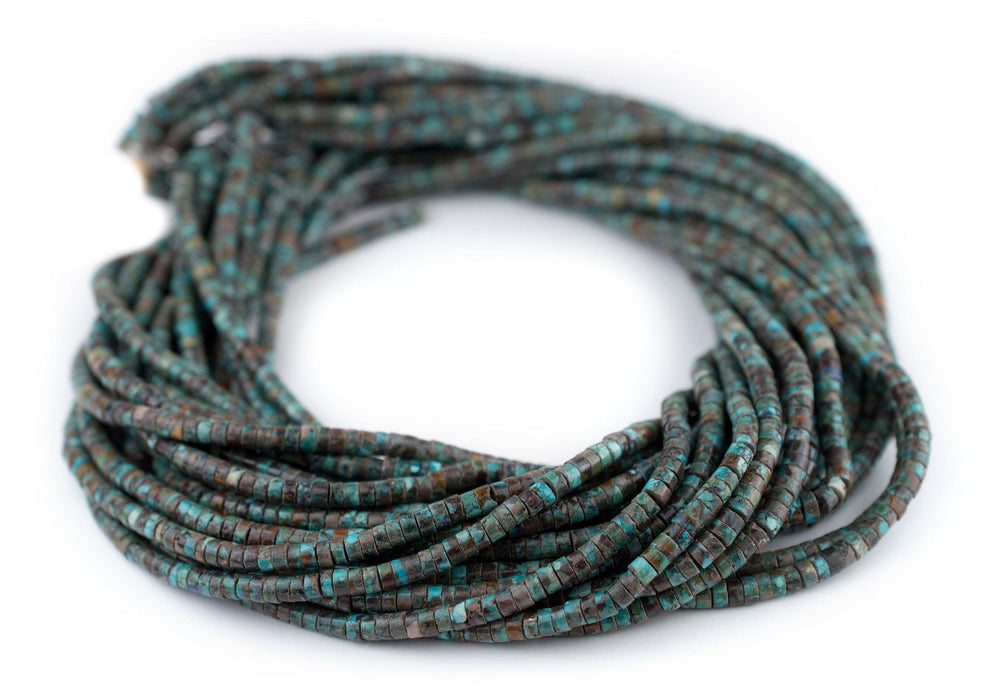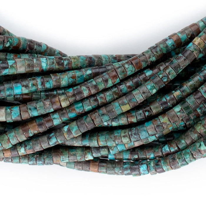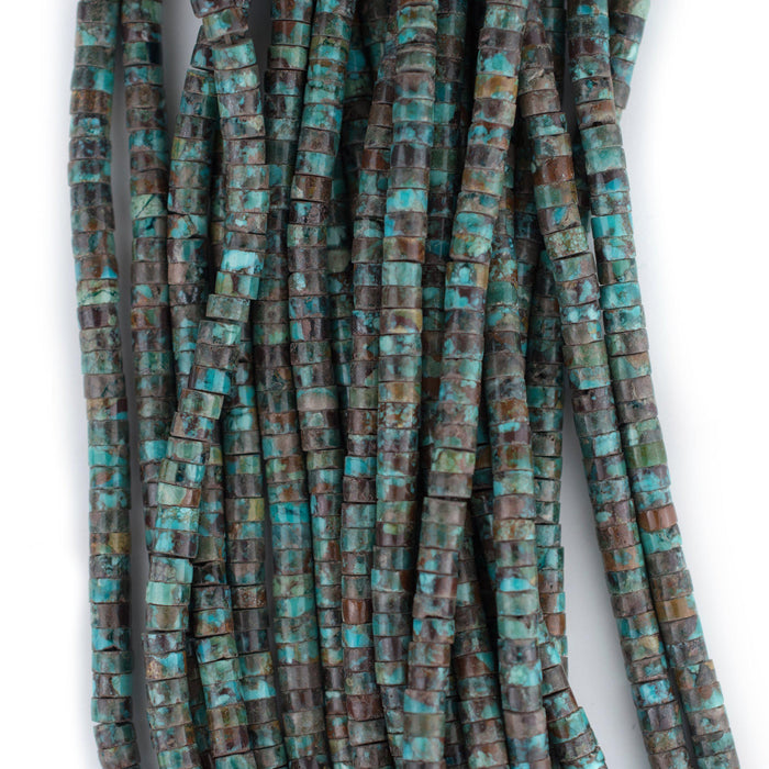 Check out this amazing strand of stone beads made of authentic turquoise. This brilliant and unique color will add an unmistakable accent to your jewelry designs. These beads are cut and polished in a natural heishi shape. Turquoise stone has been treasured since time immemorial as a protective talisman. Interestingly, it derives it's name in the English language from the Turks who were the first to introduce it to the Western World. Beads measure approximately 2 x 4mm, with holes measuring 1mm. Each strand is approximately 17" long. Multiple strands shown in photo however strands are sold individually.