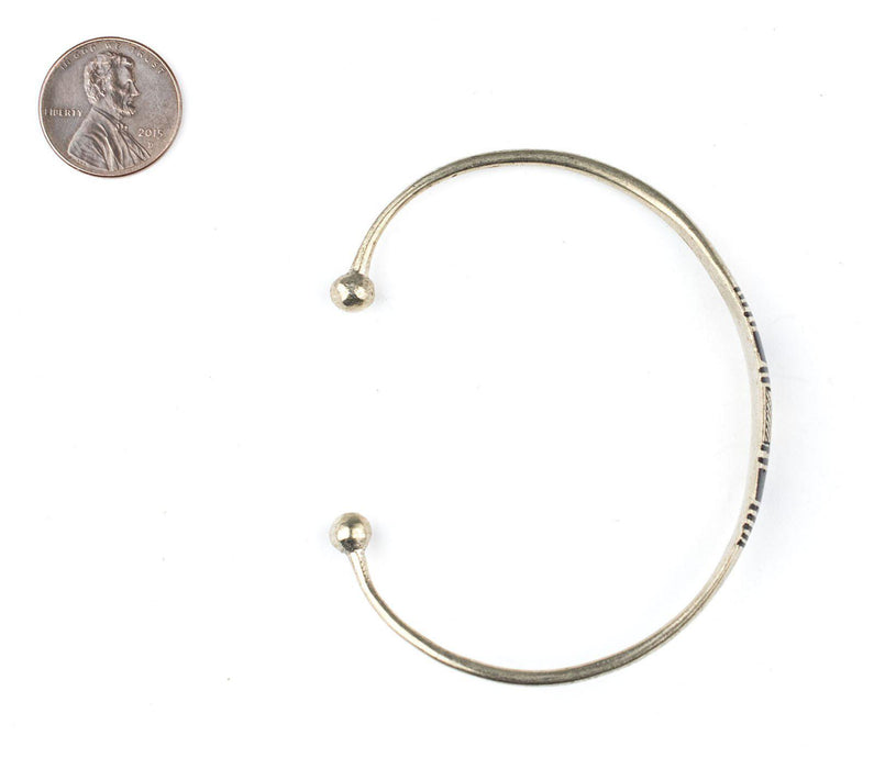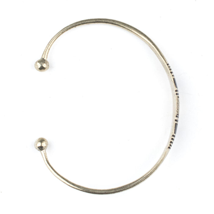 Admire this unique Tuareg cuff bracelet. The Tuaregs are a nomadic desert people that inhabit a large swath of the desert in West Africa stretching from Morocco south through Niger. Their unique style of craftsmanship is characterized by unique geometric motifs. While the patterns are traditional, the lines and designs have a subtle but somewhat modern feel. Limited supply.