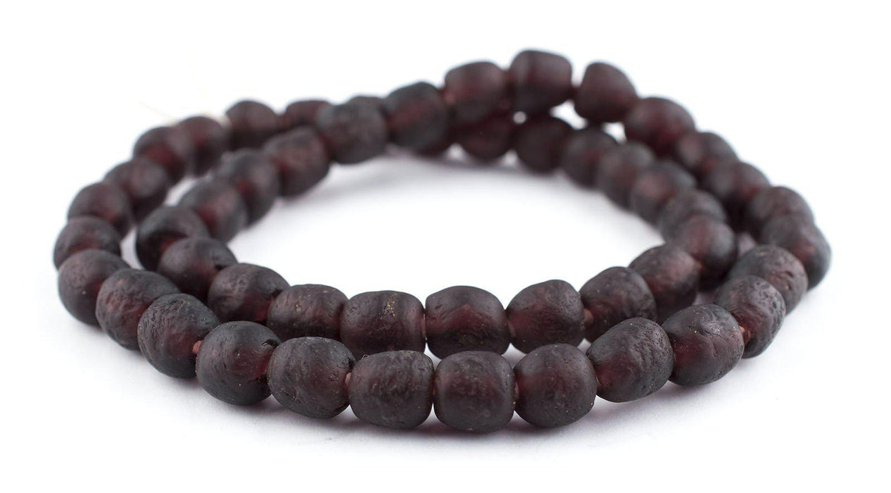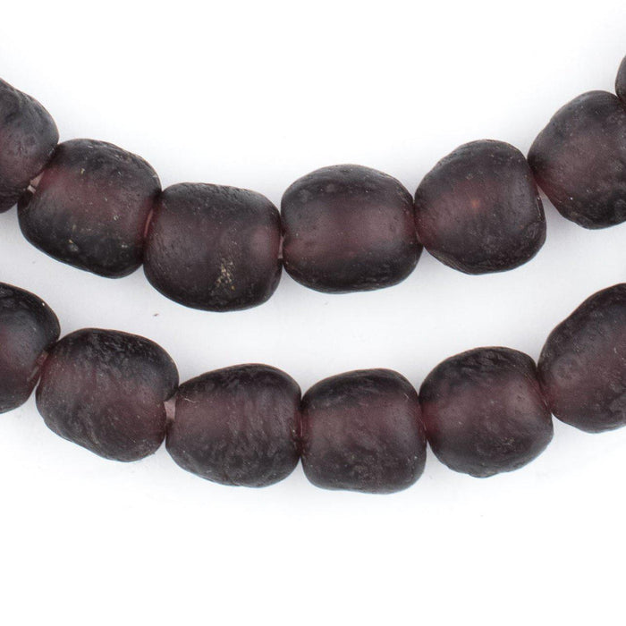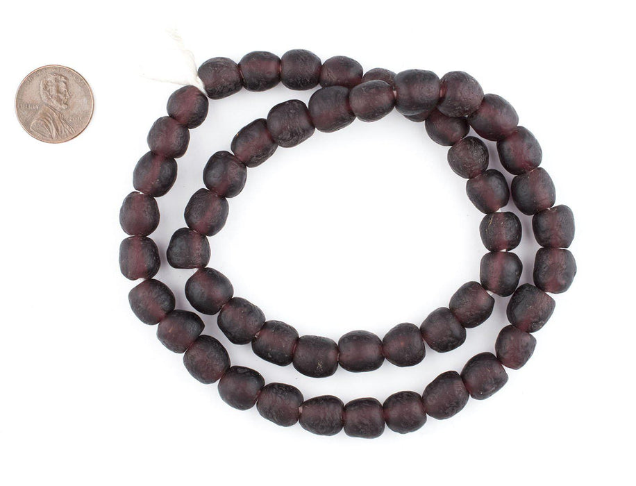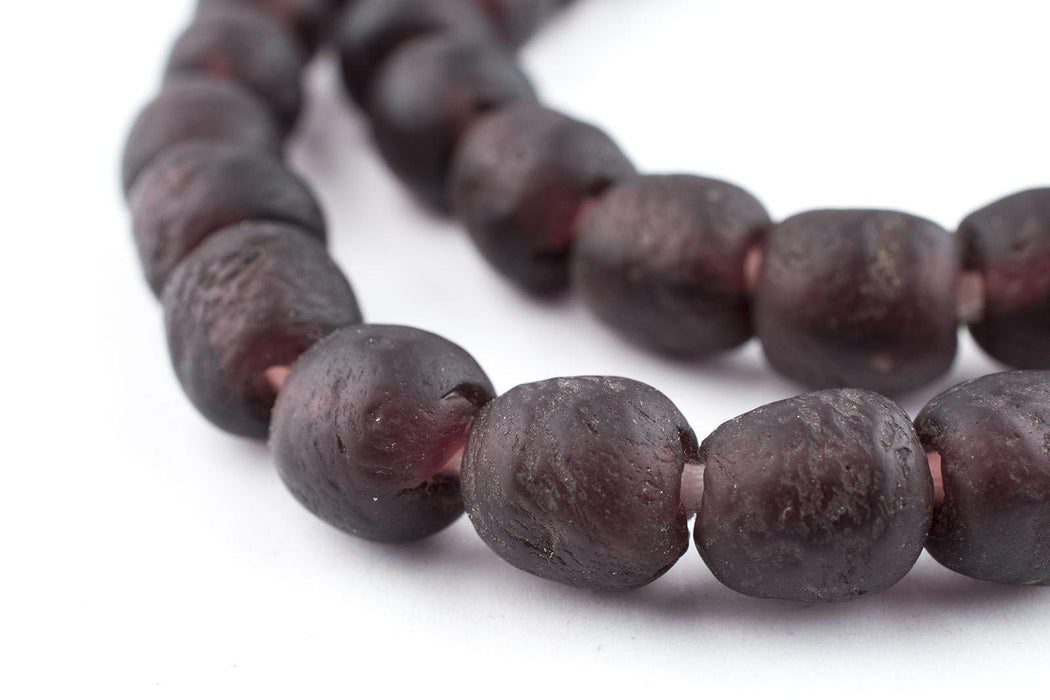 Recycled glass beads are a type of indigenously produced African bead from Ghana West Africa. These beautiful purple color recycled beads are made using an old method that has been used for centuries. The glass itself is derived from a variety of recycled sources including old beverage and medicine bottles. The procedure for making the beads consists of a number of steps whereby powdered glass is poured into molds of clay and baked in a specialized oven. These beads are produced in large part by the Krobo tribe and through recycling glass are environmentally friendly. Shade of purple may vary slightly. Some strands may not have raffia. Please inquire in advance if required.