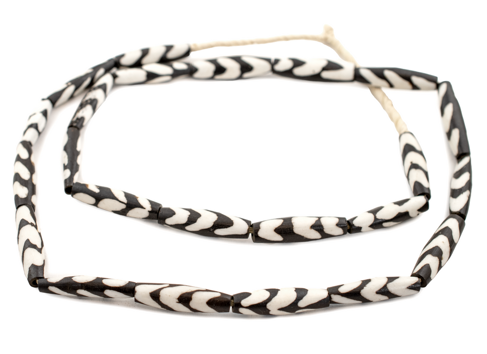 Checkout these beautiful elongated bone batik beads from Africa! Each strand is approximately 32 inches long, and the beads measure about 2-3 cm in length.