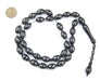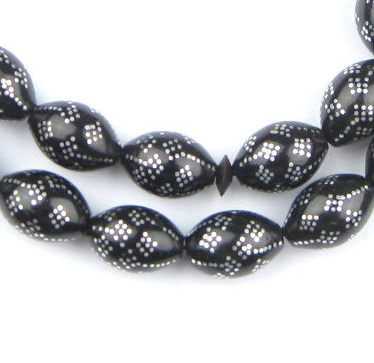 Evocative of a lost world, these beautiful Arabian prayer beads have been handcrafted by a master artisan. Look carefully and you will see that each bead has been exquisitely inlaid in meticulous detail, a quality of work hard to find in today’s day and age. The refined quality of these beads belies the long journey they have traveled through the back alleys and markets of North Africa. Prayer beads such as these embody the intersection artistic expression and faithful devotion that are a cornerstone of the Islamic world. Each bead on this strand measures approximately 14 x 10mm with hole size of 1mm and strand length of 26" long. Metal inlay may not be sterling. Use as-is or to accent your beaded creations. Limited Supply. Get yours today!