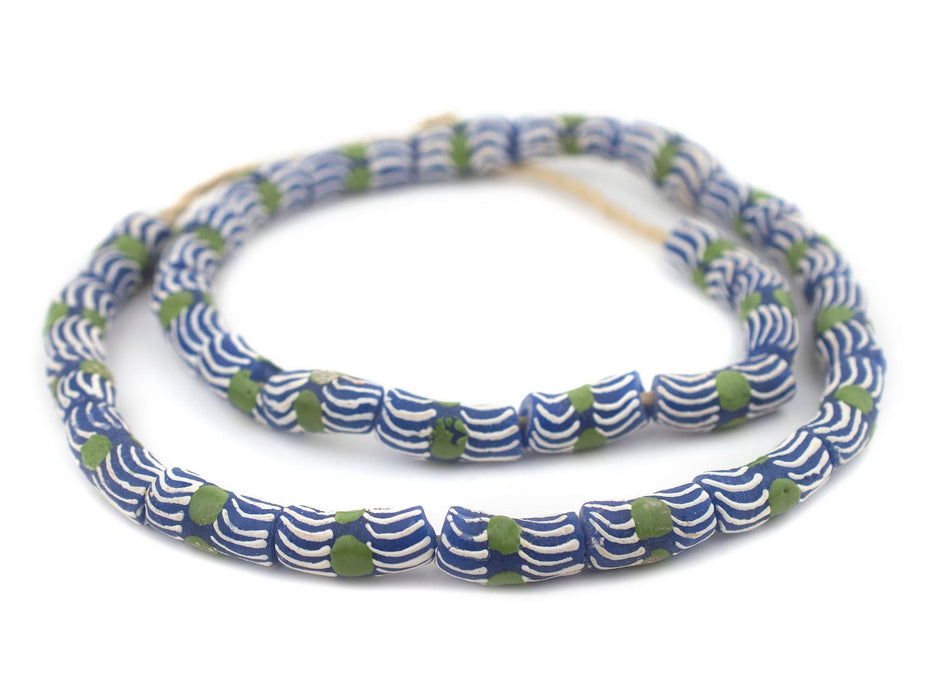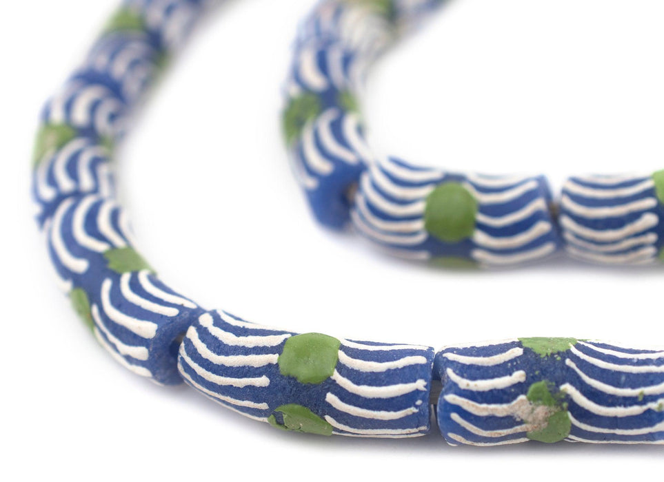 This beautiful strand of African powder glass beads was made by the people of Krobo Mountain in Ghana, West Africa. Many designs of Krobo beads are patterned to resemble old Venetian fancy trade beads. They are made from bottles and other glass items that are turned into powder, then poured into molds in order to create beads. Decorations on the beads are made with a paste made of colored glass powder and water which is applied by hand using a thin wooden stalk. The beads are cooked a second time to fix the decor. Each bead measures approximately 20-26 x 11-12mm with a hole size of approximately 2-3mm. You will receive a full strand measuring approximately 29". Limited supply.