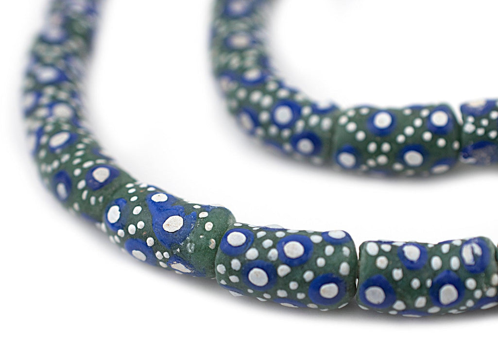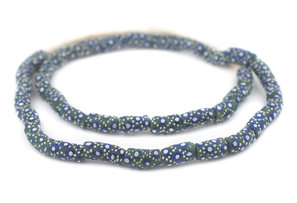 This beautiful strand of African powder glass beads was made by the people of Krobo Mountain in Ghana, West Africa. Many designs of Krobo beads are patterned to resemble old Venetian fancy trade beads. They are made from bottles and other glass items that are turned into powder, then poured into molds in order to create beads. Decorations on the beads are made with a paste made of colored glass powder and water which is applied by hand using a thin wooden stalk. The beads are cooked a second time to fix the decor. Each bead measures approximately 17-21 x 9-10mm with a hole size of approximately 3mm. You will receive a full strand measuring approximately 29". Limited supply.