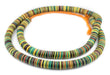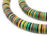 Examine this amazing strand of mixed African Vinyl Beads. Patterned in a vibrant combination of green, red and yellow tones these beads are ready to wear. You can make them into a simple waist chain or you can take the strand apart and use them in multiple design projects. Every strand is approximately 35" in length. Each bead is about 1 x 14mm with a roughly 1mm hole. Take home a strand or two for yourself today.
