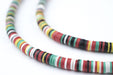 Take a look at this beautiful strand of African vinyl beads in a multicolor color. Beads such as these are found in Ghana and Nigeria where they are sometimes worn as waist beads. Older versions of vinyl beads were said to be made from recycled phonograph records. This strand measures approximately 37" long with individual beads measuring 1 x 4mm. These beads are light and fun to wear and also versatile for jewelry designs. Current stock does NOT have black.
