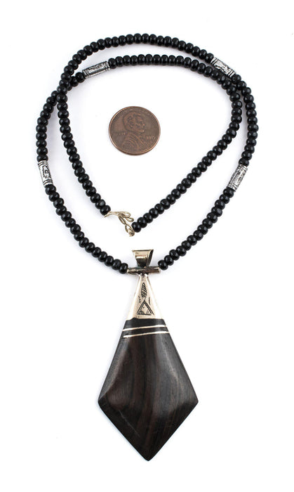 This beautiful pendant was crafted in Niger West Africa by the Tuareg people. The Tuareg are a nomadic desert tribe that inhabits a broad expanse of territory stretching from the edges of the Saharan desert of Morocco to the north as far as Burkina Faso in the south. Each pendant has been individually fashioned with ebony wood which is highly prized in Africa and in many parts of the world. Each pendant measures approximately 67 x 34mm in size and has been strung with beads and clasp. Wear the necklace “as-is” or remove the pendant and include as a centerpiece in your own original design! Each pendant is unique and may show some minor variation from picture.