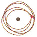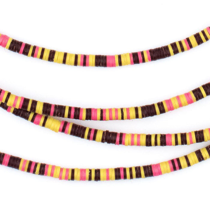Take a look at this beautiful strand of African vinyl beads multicolor color. Beads such as these are found in Ghana and Nigeria where they are sometimes worn as waist beads. Older versions of vinyl beads were said to be made from recycled phonograph records. This strand measures approximately 35" long with individual beads measuring 1 x 3mm. Bead colors include maroon brown, yellow, and pink. These beads are light and fun to wear and also versatile for jewelry designs. Multiple strands pictured. Each strand sold individually.