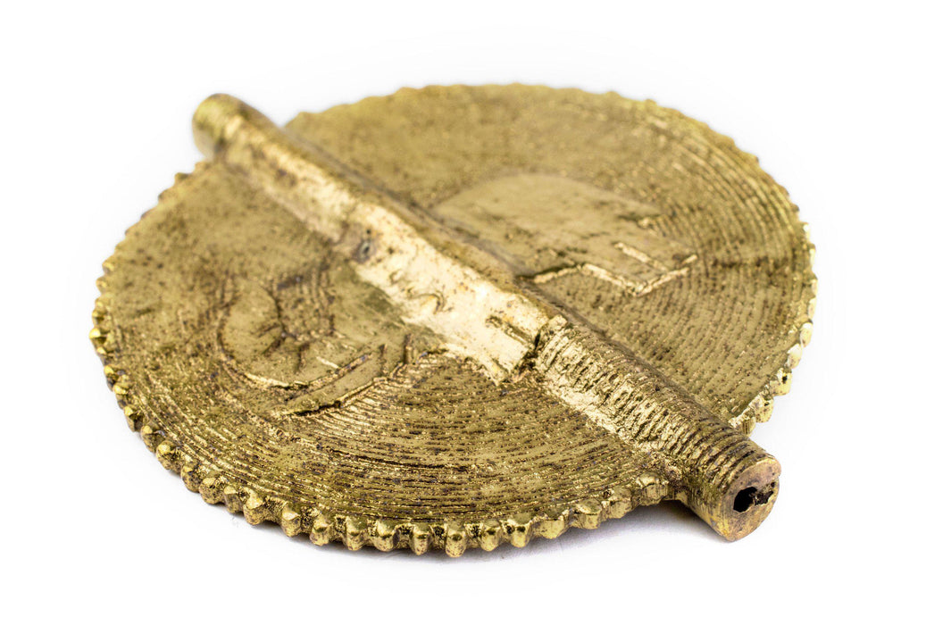 This beautiful brass bead is hand casted in the design of the traditional "Baule sun" from the Ivory Coast. Increasingly difficult to find, Baule (also known as Baoule) tribal beads are some of the most unique casted beads from West Africa. Each bead measures approximately 75 x 65mm, with a hole size of approximately 2mm. We've partnered with a special workshop to bring this unique treasure to you. Pay close attention to the detail and note the high quality finish of this special bead. Great as a pendant centerpiece on your next jewelry design!