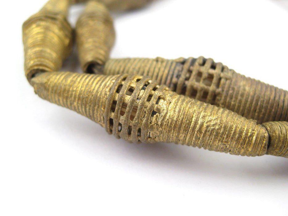 Take a look at these bicone-shaped Ghana Brass Trade Beads from Africa. Each bead is made individually through the "Lost Wax process" technique. This strand is about 26", with beads measuring approximately 40-47 x 12-15mm. Each strand may have 1-2 beads that are less than perfect. Center design may vary slightly from strand to strand.